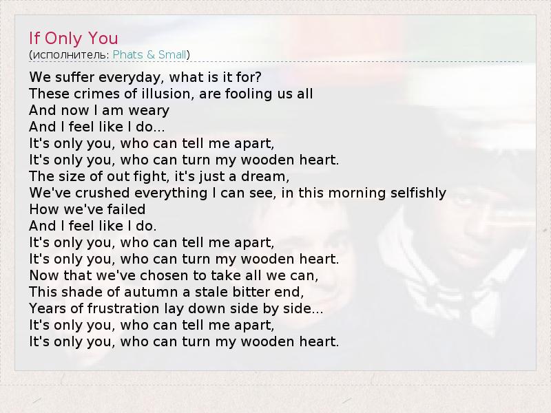 We suffer everyday, what is it for? These crimes of illusion, are fooling us all And now I am weary And I feel like I do... It's only you, who can tell me apart, It's only you, who can turn my wooden heart. The size of out fight, it's just a dream, We've crushed everything I can see, in this morning selfishly How we've failed And I feel like I do. It's only you, who can tell me apart, It's only you, who can turn my wooden heart. Now that we've chosen to take all we can, This shade of autumn a stale bitter end, Years of frustration lay down side by side... It's only you, who can tell me apart, It's only you, who can turn my wooden heart.