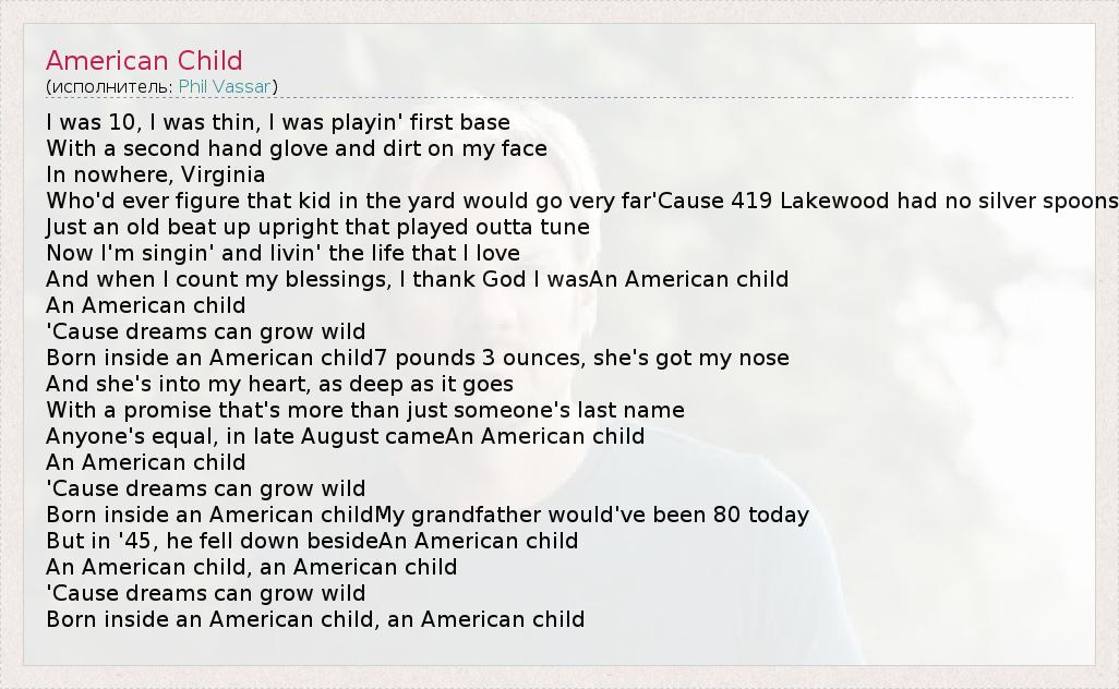 Это интересно:Фил Вассар – певец, поэт-песенник, слишком популярная творческая личность.Он родился 28-го мая в 1964-ом году, в Линчберге – маленьком живописном городке. Его мать занималась воспитанием детей (заботилась о Филе и о его двух младших сестренках). Отец Фила был певцом и довольно-таки успешно выступал в местном ресторанчике.В глубоком детстве интересы Фила Вассара не сосредотачивались... продолжение