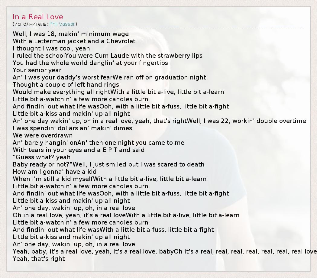 Well, I was 18, makin' minimum wage With a Letterman jacket and a Chevrolet I thought I was cool, yeah I ruled the schoolYou were Cum Laude with the strawberry lips You had the whole world danglin' at your fingertips Your senior year An' I was your daddy's worst fearWe ran off on graduation night Thought a couple of left hand rings Would make everything all rightWith a little bit a-live, little bit a-learn Little bit a-watchin' a few more candles burn And findin' out what life wasOoh, with a little bit a-fuss, little bit a-fight Little bit a-kiss and makin' up all night An' one day wakin' up, oh in a real love, yeah, that's rightWell, I was 22, workin' double overtime I was spendin' dollars an' makin' dimes We were overdrawn An' barely hangin' onAn' then one night you came to me With tears in your eyes and a E P T and said "Guess what? yeah Baby ready or not?"Well, I just smiled but I was scared to death How am I gonna' have a kid When I'm still a kid myselfWith a little bit a-live, little bit a-learn Little bit a-watchin' a few more candles burn And findin' out what life wasOoh, with a little bit a-fuss, little bit a-fight Little bit a-kiss and makin' up all night An' one day, wakin' up, oh, in a real love Oh in a real love, yeah, it's a real loveWith a little bit a-live, little bit a-learn Little bit a-watchin' a few more candles burn And findin' out what life wasWith a little bit a-fuss, little bit a-fight Little bit a-kiss and makin' up all night An' one day, wakin' up, oh, in a real love Yeah, baby, it's a real love, yeah, it's a real love, babyOh it's a real, real, real, real, real, real, real love Yeah, that's right