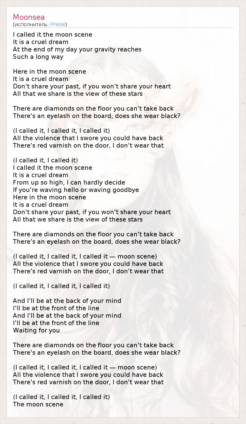I called it the moon scene It is a cruel dream At the end of my day your gravity reaches Such a long way Here in the moon scene It is a cruel dream Don't share your past, if you won't share your heart All that we share is the view of these stars There are diamonds on the floor you can't take back There's an eyelash on the board, does she wear black? (I called it, I called it, I called it) All the violence that I swore you could have back There's red varnish on the door, I don't wear that (I called it, I called it) I called it the moon scene It is a cruel dream From up so high, I can hardly decide If you're waving hello or waving goodbye Here in the moon scene It is a cruel dream Don't share your past, if you won't share your heart All that we share is the view of these stars There are diamonds on the floor you can't take back There's an eyelash on the board, does she wear black? (I called it, I called it, I called it — moon scene) All the violence that I swore you could have back There's red varnish on the door, I don't wear that (I called it, I called it, I called it) And I'll be at the back of your mind I'll be at the front of the line And I'll be at the back of your mind I'll be at the front of the line Waiting for you There are diamonds on the floor you can't take back There's an eyelash on the board, does she wear black? (I called it, I called it, I called it — moon scene) All the violence that I swore you could have back There's red varnish on the door, I don't wear that (I called it, I called it, I called it) The moon scene