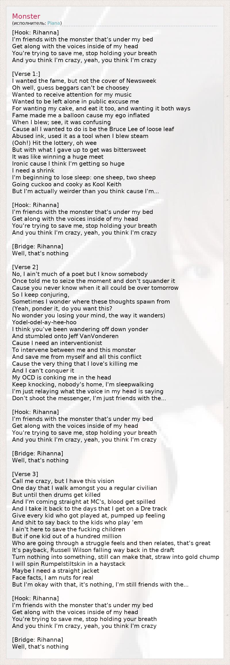 3 – Так как Рианна и Эминем слышат голоса в голове, дружат с монстрами, то люди считают их сумасшедшими. Голоса — это фанаты, монстр — слава.