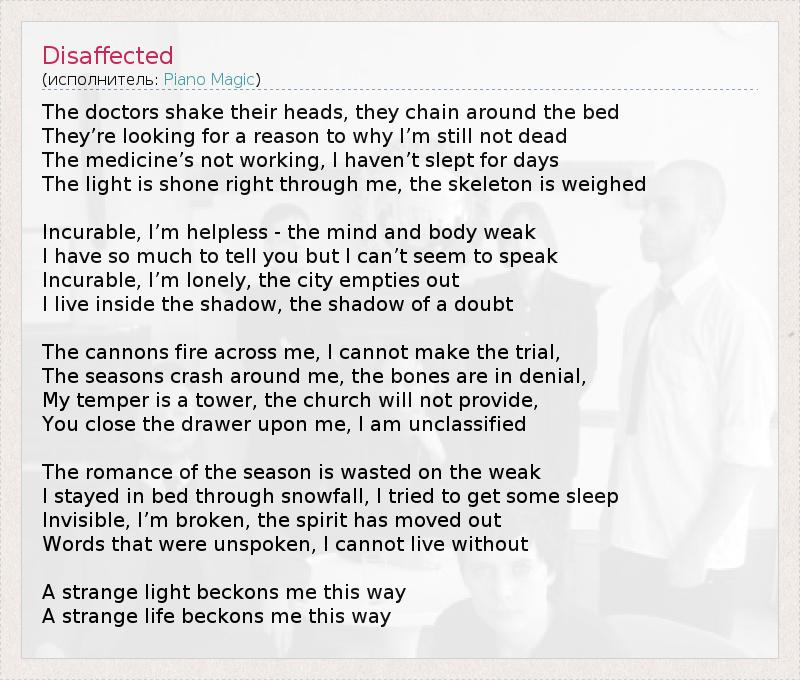 The doctors shake their heads, they chain around the bed They’re looking for a reason to why I’m still not dead The medicine’s not working, I haven’t slept for days The light is shone right through me, the skeleton is weighed Incurable, I’m helpless - the mind and body weak I have so much to tell you but I can’t seem to speak Incurable, I’m lonely, the city empties out I live inside the shadow, the shadow of a doubt The cannons fire across me, I cannot make the trial, The seasons crash around me, the bones are in denial, My temper is a tower, the church will not provide, You close the drawer upon me, I am unclassified The romance of the season is wasted on the weak I stayed in bed through snowfall, I tried to get some sleep Invisible, I’m broken, the spirit has moved out Words that were unspoken, I cannot live without A strange light beckons me this way A strange life beckons me this way