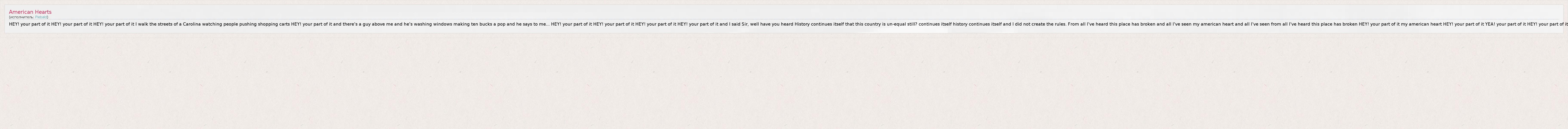 HEY! your part of it HEY! your part of it HEY! your part of it I walk the streets of a Carolina watching people pushing shopping carts HEY! your part of it and there's a guy above me and he's washing windows making ten bucks a pop and he says to me... HEY! your part of it HEY! your part of it HEY! your part of it HEY! your part of it and I said Sir, well have you heard History continues itself that this country is un-equal still? continues itself history continues itself and I did not create the rules. From all I've heard this place has broken and all I've seen my american heart and all I've seen from all I've heard this place has broken HEY! your part of it my american heart HEY! your part of it YEA! your part of it HEY! your part of it