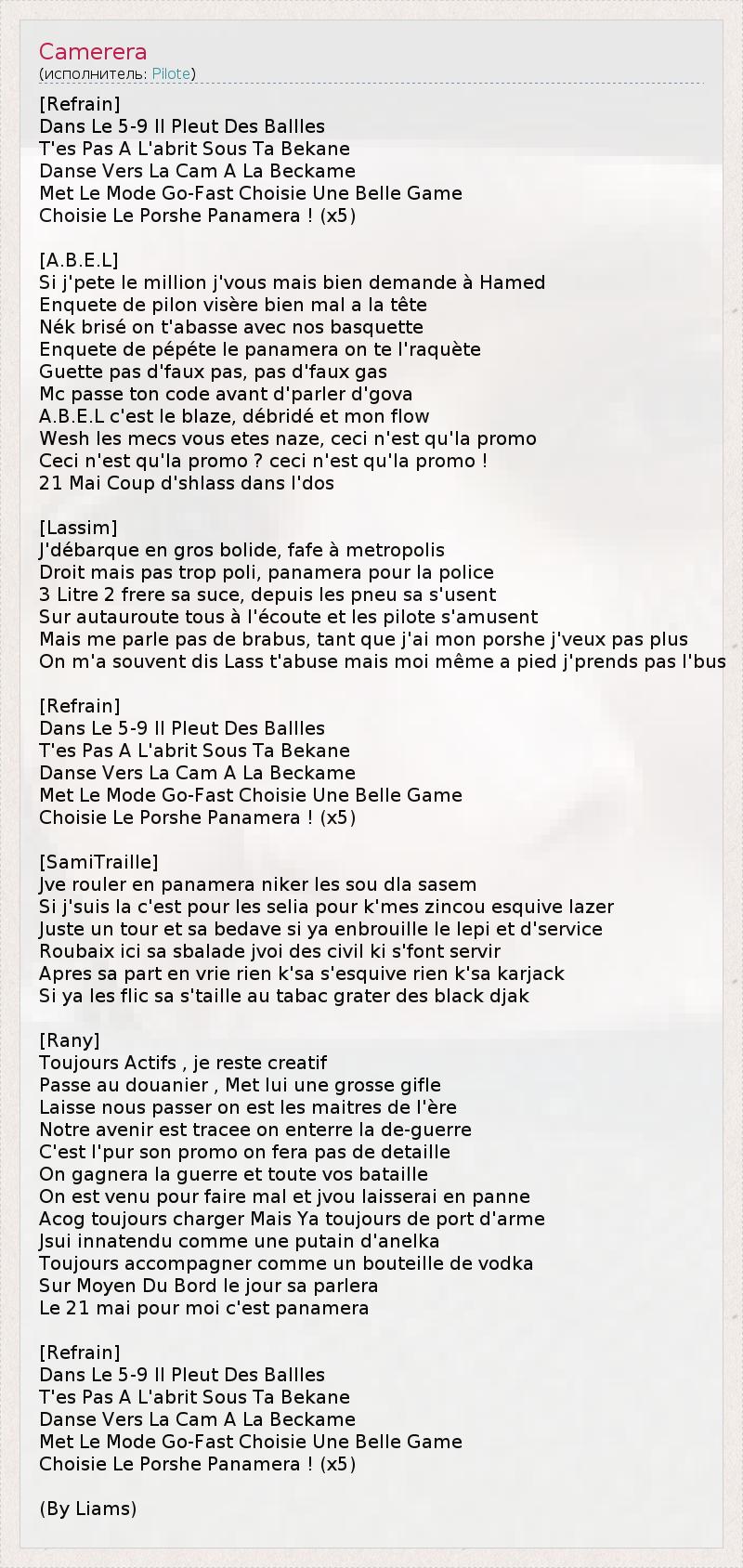 [Refrain] Dans Le 5-9 Il Pleut Des Ballles T'es Pas A L'abrit Sous Ta Bekane Danse Vers La Cam A La Beckame Met Le Mode Go-Fast Choisie Une Belle Game Choisie Le Porshe Panamera ! (x5) [A.B.E.L] Si j'pete le million j'vous mais bien demande à Hamed Enquete de pilon visère bien mal a la tête Nék brisé on t'abasse avec nos basquette Enquete de pépéte le panamera on te l'raquète Guette pas d'faux pas, pas d'faux gas Mc passe ton code avant d'parler d'gova A.B.E.L c'est le blaze, débridé et mon flow Wesh les mecs vous etes naze, ceci n'est qu'la promo Ceci n'est qu'la promo ? ceci n'est qu'la promo ! 21 Mai Coup d'shlass dans l'dos [Lassim] J'débarque en gros bolide, fafe à metropolis Droit mais pas trop poli, panamera pour la police 3 Litre 2 frere sa suce, depuis les pneu sa s'usent Sur autauroute tous à l'écoute et les pilote s'amusent Mais me parle pas de brabus, tant que j'ai mon porshe j'veux pas plus On m'a souvent dis Lass t'abuse mais moi même a pied j'prends pas l'bus [Refrain] Dans Le 5-9 Il Pleut Des Ballles T'es Pas A L'abrit Sous Ta Bekane Danse Vers La Cam A La Beckame Met Le Mode Go-Fast Choisie Une Belle Game Choisie Le Porshe Panamera ! (x5) [SamiTraille] Jve rouler en panamera niker les sou dla sasem Si j'suis la c'est pour les selia pour k'mes zincou esquive lazer Juste un tour et sa bedave si ya enbrouille le lepi et d'service Roubaix ici sa sbalade jvoi des civil ki s'font servir Apres sa part en vrie rien k'sa s'esquive rien k'sa karjack Si ya les flic sa s'taille au tabac grater des black djak [Rany] Toujours Actifs , je reste creatif Passe au douanier , Met lui une grosse gifle Laisse nous passer on est les maitres de l'ère Notre avenir est tracee on enterre la de-guerre C'est l'pur son promo on fera pas de detaille On gagnera la guerre et toute vos bataille On est venu pour faire mal et jvou laisserai en panne Acog toujours charger Mais Ya toujours de port d'arme Jsui innatendu comme une putain d'anelka Toujours accompagner comme un bouteille de vodka Sur Moyen Du Bord le jour sa parlera Le 21 mai pour moi c'est panamera [Refrain] Dans Le 5-9 Il Pleut Des Ballles T'es Pas A L'abrit Sous Ta Bekane Danse Vers La Cam A La Beckame Met Le Mode Go-Fast Choisie Une Belle Game Choisie Le Porshe Panamera ! (x5) (By Liams)