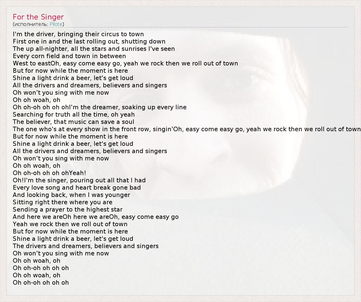 I'm the driver, bringing their circus to town First one in and the last rolling out, shutting down The up all-nighter, all the stars and sunrises I've seen Every corn field and town in between West to eastOh, easy come easy go, yeah we rock then we roll out of town But for now while the moment is here Shine a light drink a beer, let's get loud All the drivers and dreamers, believers and singers Oh won't you sing with me now Oh oh woah, oh Oh oh-oh oh oh ohI'm the dreamer, soaking up every line Searching for truth all the time, oh yeah The believer, that music can save a soul The one who's at every show in the front row, singin'Oh, easy come easy go, yeah we rock then we roll out of town But for now while the moment is here Shine a light drink a beer, let's get loud All the drivers and dreamers, believers and singers Oh won't you sing with me now Oh oh woah, oh Oh oh-oh oh oh ohYeah! Oh!I'm the singer, pouring out all that I had Every love song and heart break gone bad And looking back, when I was younger Sitting right there where you are Sending a prayer to the highest star And here we areOh here we areOh, easy come easy go Yeah we rock then we roll out of town But for now while the moment is here Shine a light drink a beer, let's get loud The drivers and dreamers, believers and singers Oh won't you sing with me now Oh oh woah, oh Oh oh-oh oh oh oh Oh oh woah, oh Oh oh-oh oh oh oh