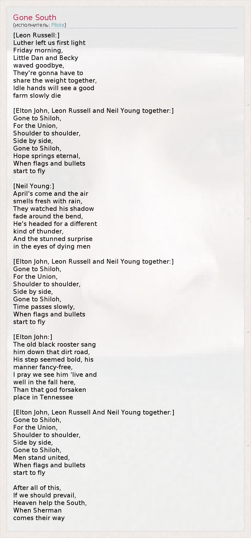 [Leon Russell:] Luther left us first light Friday morning, Little Dan and Becky waved goodbye, They're gonna have to share the weight together, Idle hands will see a good farm slowly die [Elton John, Leon Russell and Neil Young together:] Gone to Shiloh, For the Union, Shoulder to shoulder, Side by side, Gone to Shiloh, Hope springs eternal, When flags and bullets start to fly [Neil Young:] April's come and the air smells fresh with rain, They watched his shadow fade around the bend, He's headed for a different kind of thunder, And the stunned surprise in the eyes of dying men [Elton John, Leon Russell and Neil Young together:] Gone to Shiloh, For the Union, Shoulder to shoulder, Side by side, Gone to Shiloh, Time passes slowly, When flags and bullets start to fly [Elton John:] The old black rooster sang him down that dirt road, His step seemed bold, his manner fancy-free, I pray we see him ‘live and well in the fall here, Than that god forsaken place in Tennessee [Elton John, Leon Russell And Neil Young together:] Gone to Shiloh, For the Union, Shoulder to shoulder, Side by side, Gone to Shiloh, Men stand united, When flags and bullets start to fly After all of this, If we should prevail, Heaven help the South, When Sherman comes their way