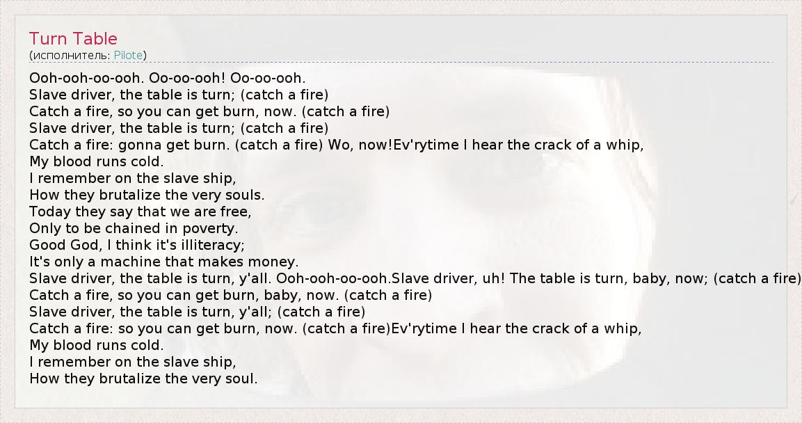 Ooh-ooh-oo-ooh. Oo-oo-ooh! Oo-oo-ooh. Slave driver, the table is turn; (catch a fire) Catch a fire, so you can get burn, now. (catch a fire) Slave driver, the table is turn; (catch a fire) Catch a fire: gonna get burn. (catch a fire) Wo, now!Ev'rytime I hear the crack of a whip, My blood runs cold. I remember on the slave ship, How they brutalize the very souls. Today they say that we are free, Only to be chained in poverty. Good God, I think it's illiteracy; It's only a machine that makes money. Slave driver, the table is turn, y'all. Ooh-ooh-oo-ooh.Slave driver, uh! The table is turn, baby, now; (catch a fire) Catch a fire, so you can get burn, baby, now. (catch a fire) Slave driver, the table is turn, y'all; (catch a fire) Catch a fire: so you can get burn, now. (catch a fire)Ev'rytime I hear the crack of a whip, My blood runs cold. I remember on the slave ship, How they brutalize the very soul.