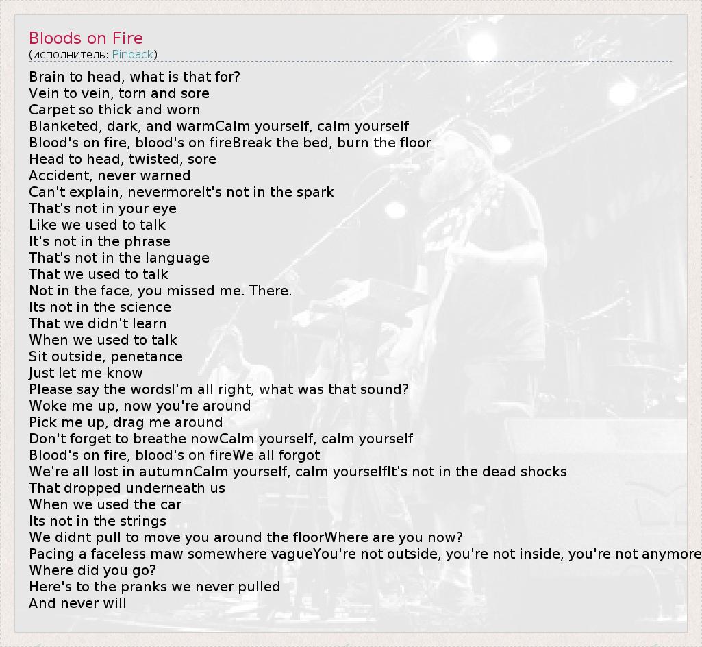 Brain to head, what is that for? Vein to vein, torn and sore Carpet so thick and worn Blanketed, dark, and warmCalm yourself, calm yourself Blood's on fire, blood's on fireBreak the bed, burn the floor Head to head, twisted, sore Accident, never warned Can't explain, nevermoreIt's not in the spark That's not in your eye Like we used to talk It's not in the phrase That's not in the language That we used to talk Not in the face, you missed me. There. Its not in the science That we didn't learn When we used to talk Sit outside, penetance Just let me know Please say the wordsI'm all right, what was that sound? Woke me up, now you're around Pick me up, drag me around Don't forget to breathe nowCalm yourself, calm yourself Blood's on fire, blood's on fireWe all forgot We're all lost in autumnCalm yourself, calm yourselfIt's not in the dead shocks That dropped underneath us When we used the car Its not in the strings We didnt pull to move you around the floorWhere are you now? Pacing a faceless maw somewhere vagueYou're not outside, you're not inside, you're not anymore Where did you go? Here's to the pranks we never pulled And never will