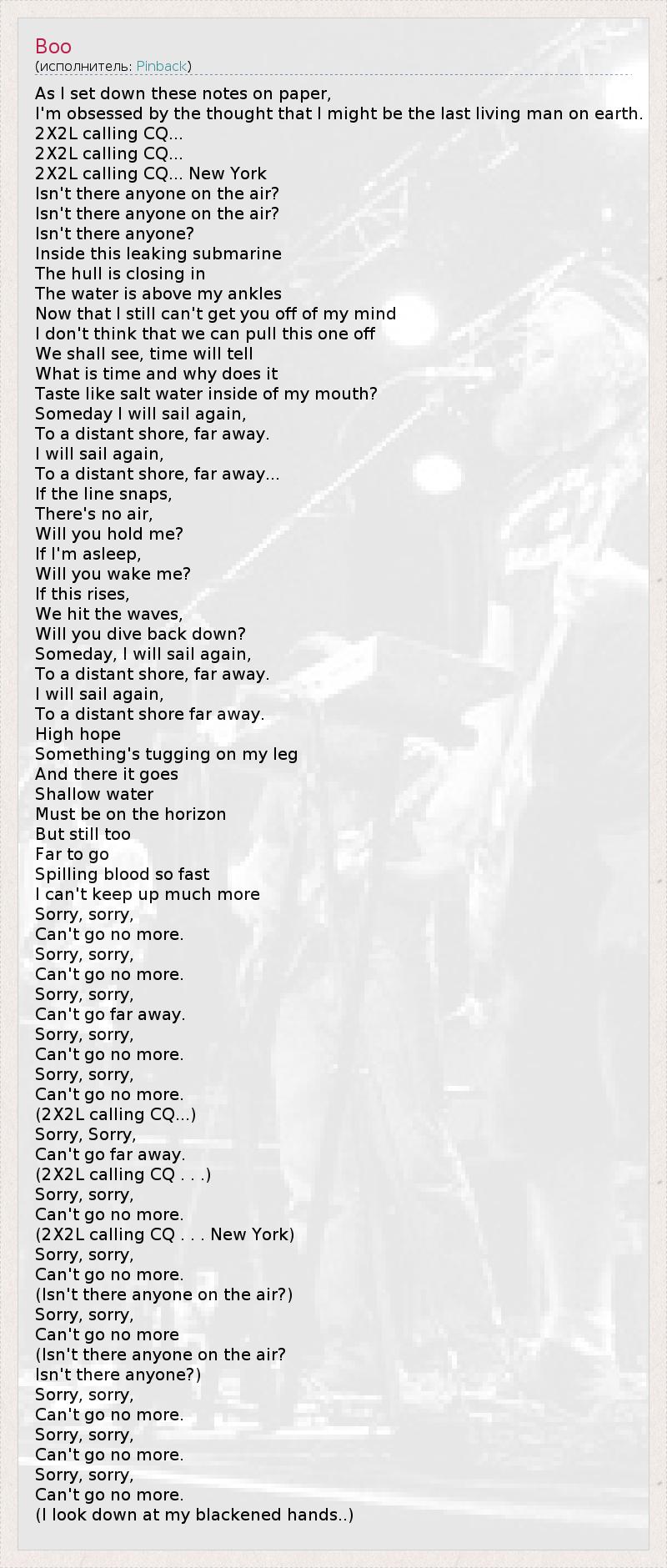 Это интересно:Pinback - indie rock группа из San Diego, CA, в данный момент подписаная на лейбле Touch and Go Records. Группа была создана в 1998 двумя певцами и мульти-инструменталистами: Армистэдом Бурвеллом Смитом Четвертым (или просто - Зак Смит) и Робом Кроу.За 10 лет существования группа записала четыре полноформатных альбома, последний из которых, The Autumn Of Seraphs, вышел... продолжение