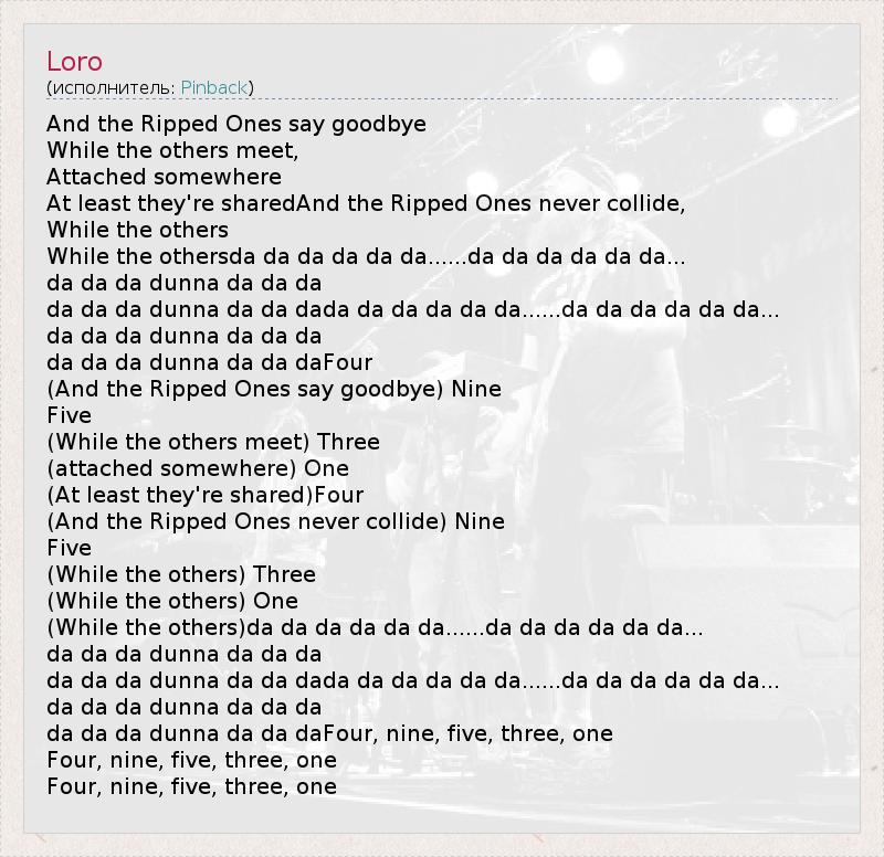 Это интересно:Pinback - indie rock группа из San Diego, CA, в данный момент подписаная на лейбле Touch and Go Records. Группа была создана в 1998 двумя певцами и мульти-инструменталистами: Армистэдом Бурвеллом Смитом Четвертым (или просто - Зак Смит) и Робом Кроу.За 10 лет существования группа записала четыре полноформатных альбома, последний из которых, The Autumn Of Seraphs, вышел... продолжение