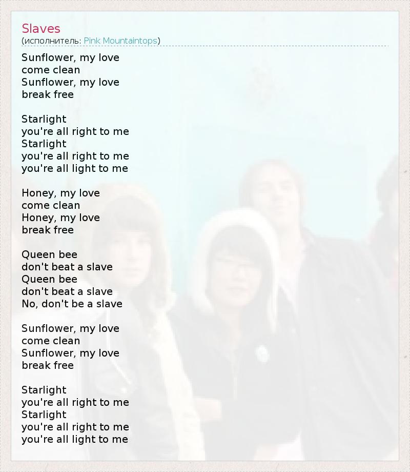 Sunflower, my love come clean Sunflower, my love break free Starlight you're all right to me Starlight you're all right to me you're all light to me Honey, my love come clean Honey, my love break free Queen bee don't beat a slave Queen bee don't beat a slave No, don't be a slave Sunflower, my love come clean Sunflower, my love break free Starlight you're all right to me Starlight you're all right to me you're all light to me