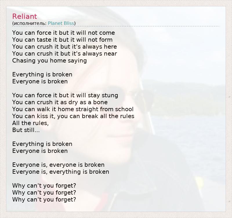 Ты можешь приложить силу, но оно не придет, Ты можешь попробовать его на вкус, но оно не примет формы, Ты можешь раздавить его, но оно всегда будет здесь, Ты можешь раздавить его, но оно всегда будет рядом, Оно последует за тобой до самого дома, говоря о том, что Все разбито, Все разбиты. Ты можешь приложить силу, но оно продолжит жалить, Ты можешь раздавить его, как сухую кость, Ты можешь проводить его домой сразу после школы, Вы можешь поцеловать его, ты можешь нарушить все правила Все правила, Но все же ... Все разбито, Все разбиты. Все, все разбиты, Все, все разбиты. Почему же ты не можешь забыть? Почему же ты не можешь забыть? Почему же ты не можешь забыть?