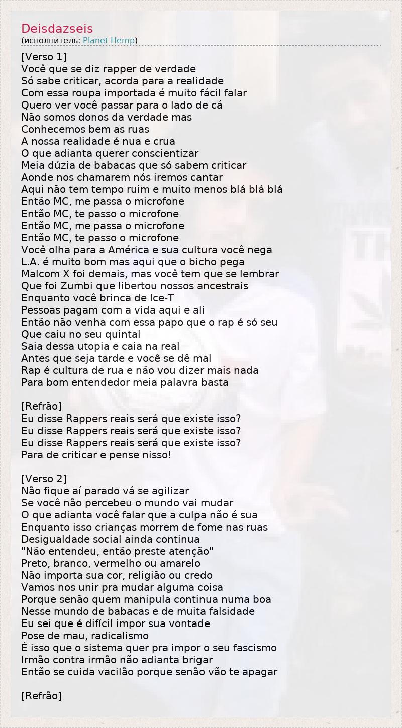 [Verso 1] Você que se diz rapper de verdade Só sabe criticar, acorda para a realidade Com essa roupa importada é muito fácil falar Quero ver você passar para o lado de cá Não somos donos da verdade mas Conhecemos bem as ruas A nossa realidade é nua e crua O que adianta querer conscientizar Meia dúzia de babacas que só sabem criticar Aonde nos chamarem nós iremos cantar Aqui não tem tempo ruim e muito menos blá blá blá Então MC, me passa o microfone Então MC, te passo o microfone Então MC, me passa o microfone Então MC, te passo o microfone Você olha para a América e sua cultura você nega L.A. é muito bom mas aqui que o bicho pega Malcom X foi demais, mas você tem que se lembrar Que foi Zumbi que libertou nossos ancestrais Enquanto você brinca de Ice-T Pessoas pagam com a vida aqui e ali Então não venha com essa papo que o rap é só seu Que caiu no seu quintal Saia dessa utopia e caia na real Antes que seja tarde e você se dê mal Rap é cultura de rua e não vou dizer mais nada Para bom entendedor meia palavra basta [Refrão] Eu disse Rappers reais será que existe isso? Eu disse Rappers reais será que existe isso? Eu disse Rappers reais será que existe isso? Para de criticar e pense nisso! [Verso 2] Não fique aí parado vá se agilizar Se você não percebeu o mundo vai mudar O que adianta você falar que a culpa não é sua Enquanto isso crianças morrem de fome nas ruas Desigualdade social ainda continua "Não entendeu, então preste atenção" Preto, branco, vermelho ou amarelo Não importa sua cor, religião ou credo Vamos nos unir pra mudar alguma coisa Porque senão quem manipula continua numa boa Nesse mundo de babacas e de muita falsidade Eu sei que é difícil impor sua vontade Pose de mau, radicalismo É isso que o sistema quer pra impor o seu fascismo Irmão contra irmão não adianta brigar Então se cuida vacilão porque senão vão te apagar [Refrão]