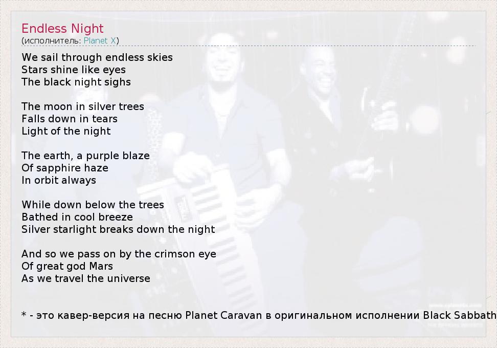 We sail through endless skies Stars shine like eyes The black night sighs The moon in silver trees Falls down in tears Light of the night The earth, a purple blaze Of sapphire haze In orbit always While down below the trees Bathed in cool breeze Silver starlight breaks down the night And so we pass on by the crimson eye Of great god Mars As we travel the universe * - это кавер-версия на песню Planet Caravan в оригинальном исполнении Black Sabbath