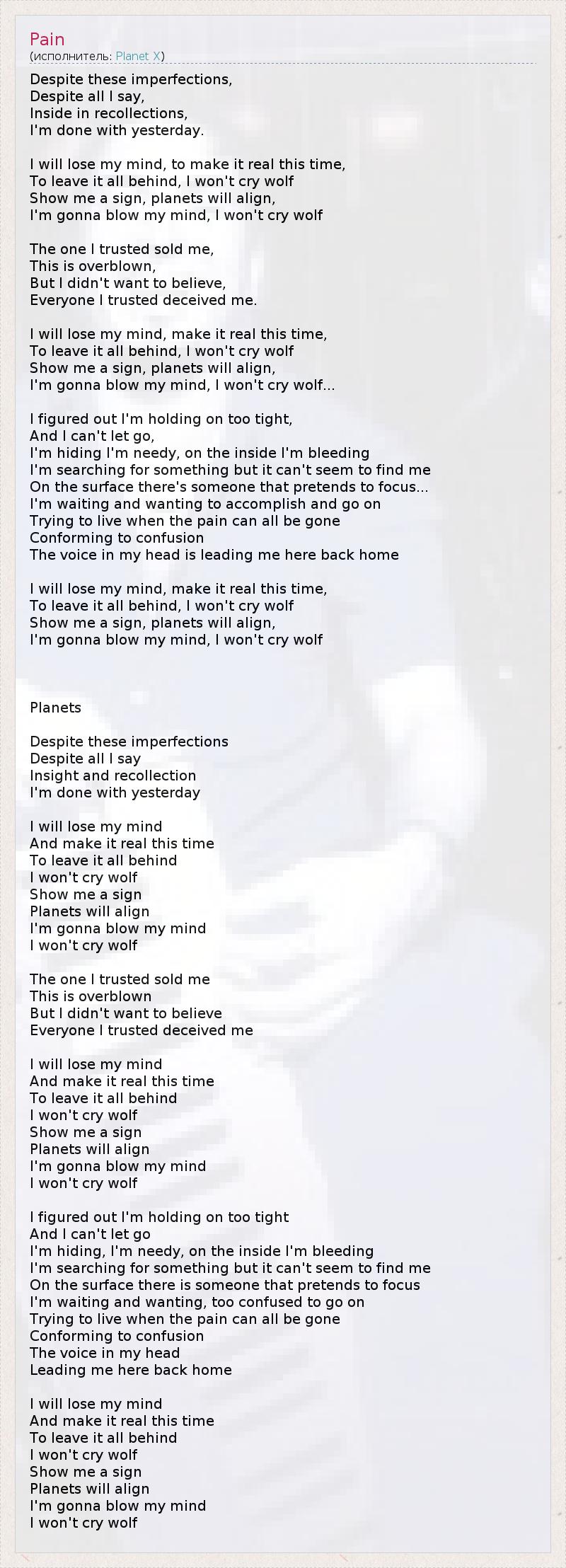Despite these imperfections, Despite all I say, Inside in recollections, I'm done with yesterday. I will lose my mind, to make it real this time, To leave it all behind, I won't cry wolf Show me a sign, planets will align, I'm gonna blow my mind, I won't cry wolf The one I trusted sold me, This is overblown, But I didn't want to believe, Everyone I trusted deceived me. I will lose my mind, make it real this time, To leave it all behind, I won't cry wolf Show me a sign, planets will align, I'm gonna blow my mind, I won't cry wolf... I figured out I'm holding on too tight, And I can't let go, I'm hiding I'm needy, on the inside I'm bleeding I'm searching for something but it can't seem to find me On the surface there's someone that pretends to focus... I'm waiting and wanting to accomplish and go on Trying to live when the pain can all be gone Conforming to confusion The voice in my head is leading me here back home I will lose my mind, make it real this time, To leave it all behind, I won't cry wolf Show me a sign, planets will align, I'm gonna blow my mind, I won't cry wolf Planets Despite these imperfections Despite all I say Insight and recollection I'm done with yesterday I will lose my mind And make it real this time To leave it all behind I won't cry wolf Show me a sign Planets will align I'm gonna blow my mind I won't cry wolf The one I trusted sold me This is overblown But I didn't want to believe Everyone I trusted deceived me I will lose my mind And make it real this time To leave it all behind I won't cry wolf Show me a sign Planets will align I'm gonna blow my mind I won't cry wolf I figured out I'm holding on too tight And I can't let go I'm hiding, I'm needy, on the inside I'm bleeding I'm searching for something but it can't seem to find me On the surface there is someone that pretends to focus I'm waiting and wanting, too confused to go on Trying to live when the pain can all be gone Conforming to confusion The voice in my head Leading me here back home I will lose my mind And make it real this time To leave it all behind I won't cry wolf Show me a sign Planets will align I'm gonna blow my mind I won't cry wolf