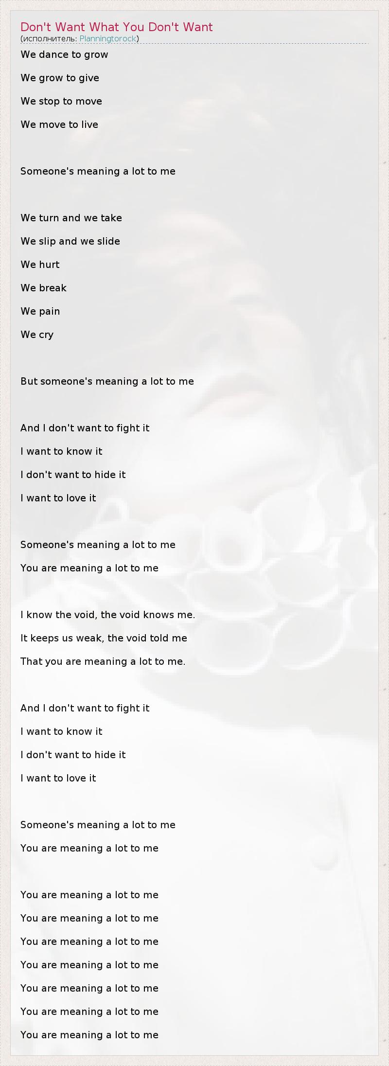 We dance to grow We grow to give We stop to move We move to live Someone's meaning a lot to me We turn and we take We slip and we slide We hurt We break We pain We cry But someone's meaning a lot to me And I don't want to fight it I want to know it I don't want to hide it I want to love it Someone's meaning a lot to me You are meaning a lot to me I know the void, the void knows me. It keeps us weak, the void told me That you are meaning a lot to me. And I don't want to fight it I want to know it I don't want to hide it I want to love it Someone's meaning a lot to me You are meaning a lot to me You are meaning a lot to me You are meaning a lot to me You are meaning a lot to me You are meaning a lot to me You are meaning a lot to me You are meaning a lot to me You are meaning a lot to me