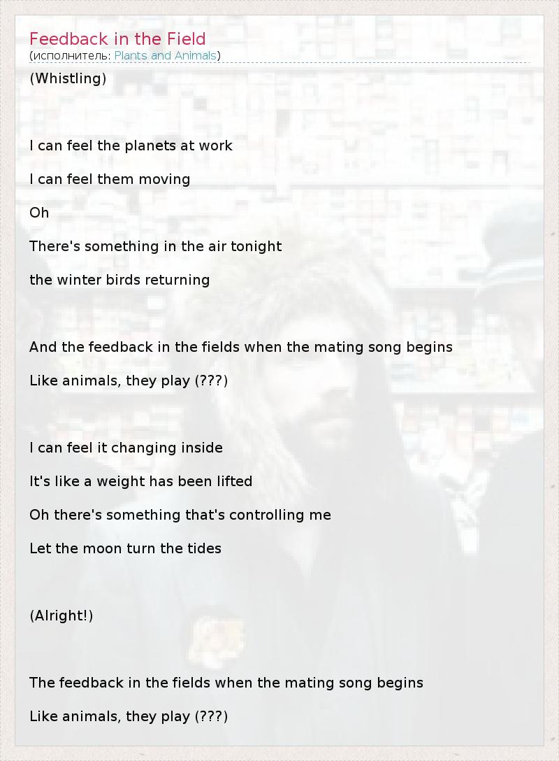 (Whistling) I can feel the planets at work I can feel them moving Oh There's something in the air tonight the winter birds returning And the feedback in the fields when the mating song begins Like animals, they play (???) I can feel it changing inside It's like a weight has been lifted Oh there's something that's controlling me Let the moon turn the tides (Alright!) The feedback in the fields when the mating song begins Like animals, they play (???)