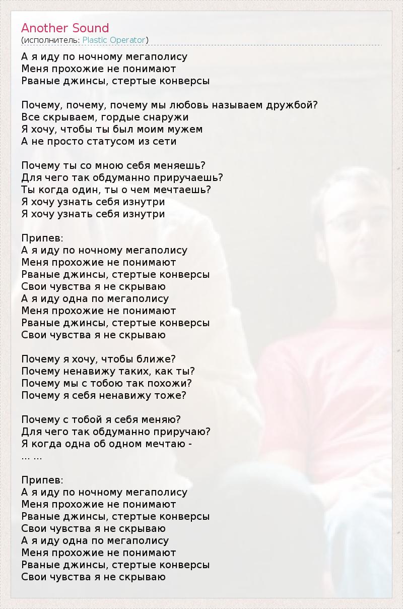 А я иду по ночному мегаполису Меня прохожие не понимают Рваные джинсы, стертые конверсы Почему, почему, почему мы любовь называем дружбой? Все скрываем, гордые снаружи Я хочу, чтобы ты был моим мужем А не просто статусом из сети Почему ты со мною себя меняешь? Для чего так обдуманно приручаешь? Ты когда один, ты о чем мечтаешь? Я хочу узнать себя изнутри Я хочу узнать себя изнутри Припев: А я иду по ночному мегаполису Меня прохожие не понимают Рваные джинсы, стертые конверсы Свои чувства я не скрываю А я иду одна по мегаполису Меня прохожие не понимают Рваные джинсы, стертые конверсы Свои чувства я не скрываю Почему я хочу, чтобы ближе? Почему ненавижу таких, как ты? Почему мы с тобою так похожи? Почему я себя ненавижу тоже? Почему с тобой я себя меняю? Для чего так обдуманно приручаю? Я когда одна об одном мечтаю - ... ... Припев: А я иду по ночному мегаполису Меня прохожие не понимают Рваные джинсы, стертые конверсы Свои чувства я не скрываю А я иду одна по мегаполису Меня прохожие не понимают Рваные джинсы, стертые конверсы Свои чувства я не скрываю