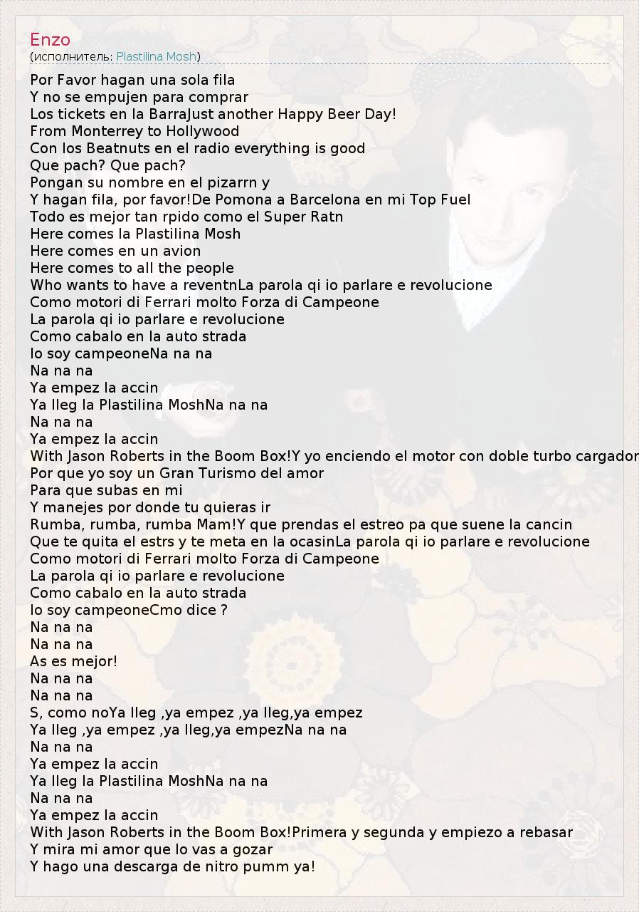 Por Favor hagan una sola fila Y no se empujen para comprar Los tickets en la BarraJust another Happy Beer Day! From Monterrey to Hollywood Con los Beatnuts en el radio everything is good Que pach? Que pach? Pongan su nombre en el pizarrn y Y hagan fila, por favor!De Pomona a Barcelona en mi Top Fuel Todo es mejor tan rpido como el Super Ratn Here comes la Plastilina Mosh Here comes en un avion Here comes to all the people Who wants to have a reventnLa parola qi io parlare e revolucione Como motori di Ferrari molto Forza di Campeone La parola qi io parlare e revolucione Como cabalo en la auto strada Io soy campeoneNa na na Na na na Ya empez la accin Ya lleg la Plastilina MoshNa na na Na na na Ya empez la accin With Jason Roberts in the Boom Box!Y yo enciendo el motor con doble turbo cargador Por que yo soy un Gran Turismo del amor Para que subas en mi Y manejes por donde tu quieras ir Rumba, rumba, rumba Mam!Y que prendas el estreo pa que suene la cancin Que te quita el estrs y te meta en la ocasinLa parola qi io parlare e revolucione Como motori di Ferrari molto Forza di Campeone La parola qi io parlare e revolucione Como cabalo en la auto strada Io soy campeoneCmo dice ? Na na na Na na na As es mejor! Na na na Na na na S, como noYa lleg ,ya empez ,ya lleg,ya empez Ya lleg ,ya empez ,ya lleg,ya empezNa na na Na na na Ya empez la accin Ya lleg la Plastilina MoshNa na na Na na na Ya empez la accin With Jason Roberts in the Boom Box!Primera y segunda y empiezo a rebasar Y mira mi amor que lo vas a gozar Y hago una descarga de nitro pumm ya!