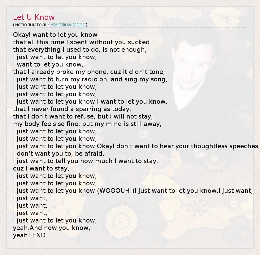 OkayI want to let you know that all this time I spent without you sucked that everything I used to do, is not enough, I just want to let you know, I want to let you know, that I already broke my phone, cuz it didn't tone, I just want to turn my radio on, and sing my song, I just want to let you know, I just want to let you know, I just want to let you know.I want to let you know, that I never found a sparring as today, that I don't want to refuse, but i will not stay, my body feels so fine, but my mind is still away, I just want to let you know, I just want to let you know, I just want to let you know.OkayI don't want to hear your thoughtless speeches, i don't want you to, be afraid, I just want to tell you how much I want to stay, cuz I want to stay, I just want to let you know, I just want to let you know, I just want to let you know.(WOOOUH!)I just want to let you know.I just want, I just want, I just want, I just want, I just want to let you know, yeah.And now you know, yeah!.END.