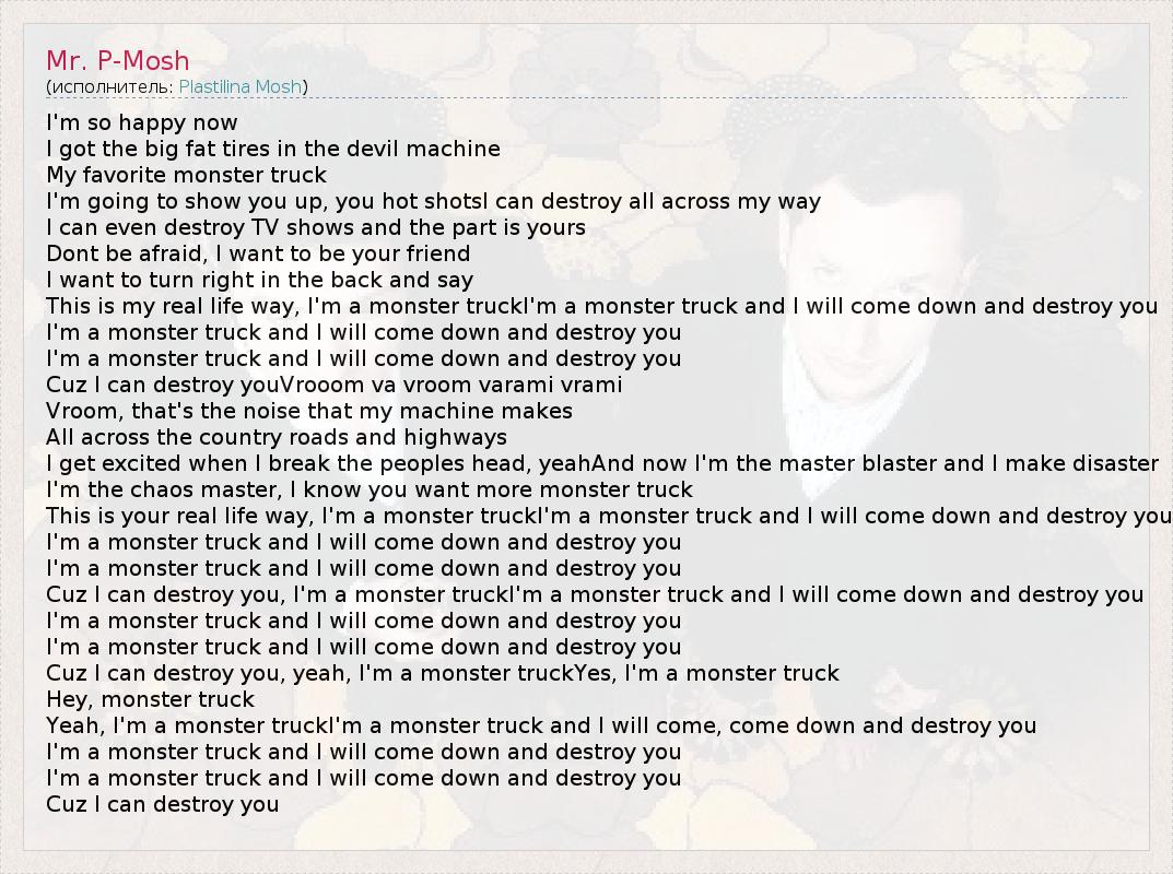 I'm so happy now I got the big fat tires in the devil machine My favorite monster truck I'm going to show you up, you hot shotsI can destroy all across my way I can even destroy TV shows and the part is yours Dont be afraid, I want to be your friend I want to turn right in the back and say This is my real life way, I'm a monster truckI'm a monster truck and I will come down and destroy you I'm a monster truck and I will come down and destroy you I'm a monster truck and I will come down and destroy you Cuz I can destroy youVrooom va vroom varami vrami Vroom, that's the noise that my machine makes All across the country roads and highways I get excited when I break the peoples head, yeahAnd now I'm the master blaster and I make disaster I'm the chaos master, I know you want more monster truck This is your real life way, I'm a monster truckI'm a monster truck and I will come down and destroy you I'm a monster truck and I will come down and destroy you I'm a monster truck and I will come down and destroy you Cuz I can destroy you, I'm a monster truckI'm a monster truck and I will come down and destroy you I'm a monster truck and I will come down and destroy you I'm a monster truck and I will come down and destroy you Cuz I can destroy you, yeah, I'm a monster truckYes, I'm a monster truck Hey, monster truck Yeah, I'm a monster truckI'm a monster truck and I will come, come down and destroy you I'm a monster truck and I will come down and destroy you I'm a monster truck and I will come down and destroy you Cuz I can destroy you