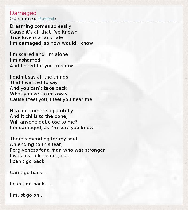 Dreaming comes so easily Cause it's all that I've known True love is a fairy tale I'm damaged, so how would I know I'm scared and I'm alone I'm ashamed And I need for you to know I didn't say all the things That I wanted to say And you can't take back What you've taken away Cause I feel you, I feel you near me Healing comes so painfully And it chills to the bone, Will anyone get close to me? I'm damaged, as I'm sure you know There's mending for my soul An ending to this fear, Forgiveness for a man who was stronger I was just a little girl, but I can't go back Can't go back..... I can't go back..... I must go on...