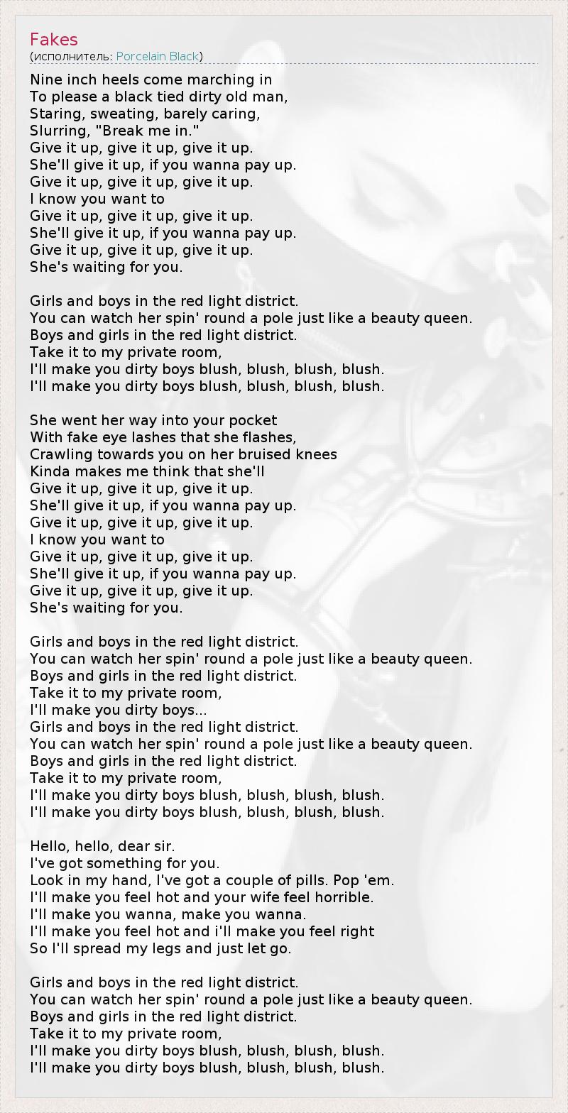 Nine inch heels come marching in To please a black tied dirty old man, Staring, sweating, barely caring, Slurring, "Break me in." Give it up, give it up, give it up. She'll give it up, if you wanna pay up. Give it up, give it up, give it up. I know you want to Give it up, give it up, give it up. She'll give it up, if you wanna pay up. Give it up, give it up, give it up. She's waiting for you. Girls and boys in the red light district. You can watch her spin' round a pole just like a beauty queen. Boys and girls in the red light district. Take it to my private room, I'll make you dirty boys blush, blush, blush, blush. I'll make you dirty boys blush, blush, blush, blush. She went her way into your pocket With fake eye lashes that she flashes, Crawling towards you on her bruised knees Kinda makes me think that she'll Give it up, give it up, give it up. She'll give it up, if you wanna pay up. Give it up, give it up, give it up. I know you want to Give it up, give it up, give it up. She'll give it up, if you wanna pay up. Give it up, give it up, give it up. She's waiting for you. Girls and boys in the red light district. You can watch her spin' round a pole just like a beauty queen. Boys and girls in the red light district. Take it to my private room, I'll make you dirty boys... Girls and boys in the red light district. You can watch her spin' round a pole just like a beauty queen. Boys and girls in the red light district. Take it to my private room, I'll make you dirty boys blush, blush, blush, blush. I'll make you dirty boys blush, blush, blush, blush. Hello, hello, dear sir. I've got something for you. Look in my hand, I've got a couple of pills. Pop 'em. I'll make you feel hot and your wife feel horrible. I'll make you wanna, make you wanna. I'll make you feel hot and i'll make you feel right So I'll spread my legs and just let go. Girls and boys in the red light district. You can watch her spin' round a pole just like a beauty queen. Boys and girls in the red light district. Take it to my private room, I'll make you dirty boys blush, blush, blush, blush. I'll make you dirty boys blush, blush, blush, blush.