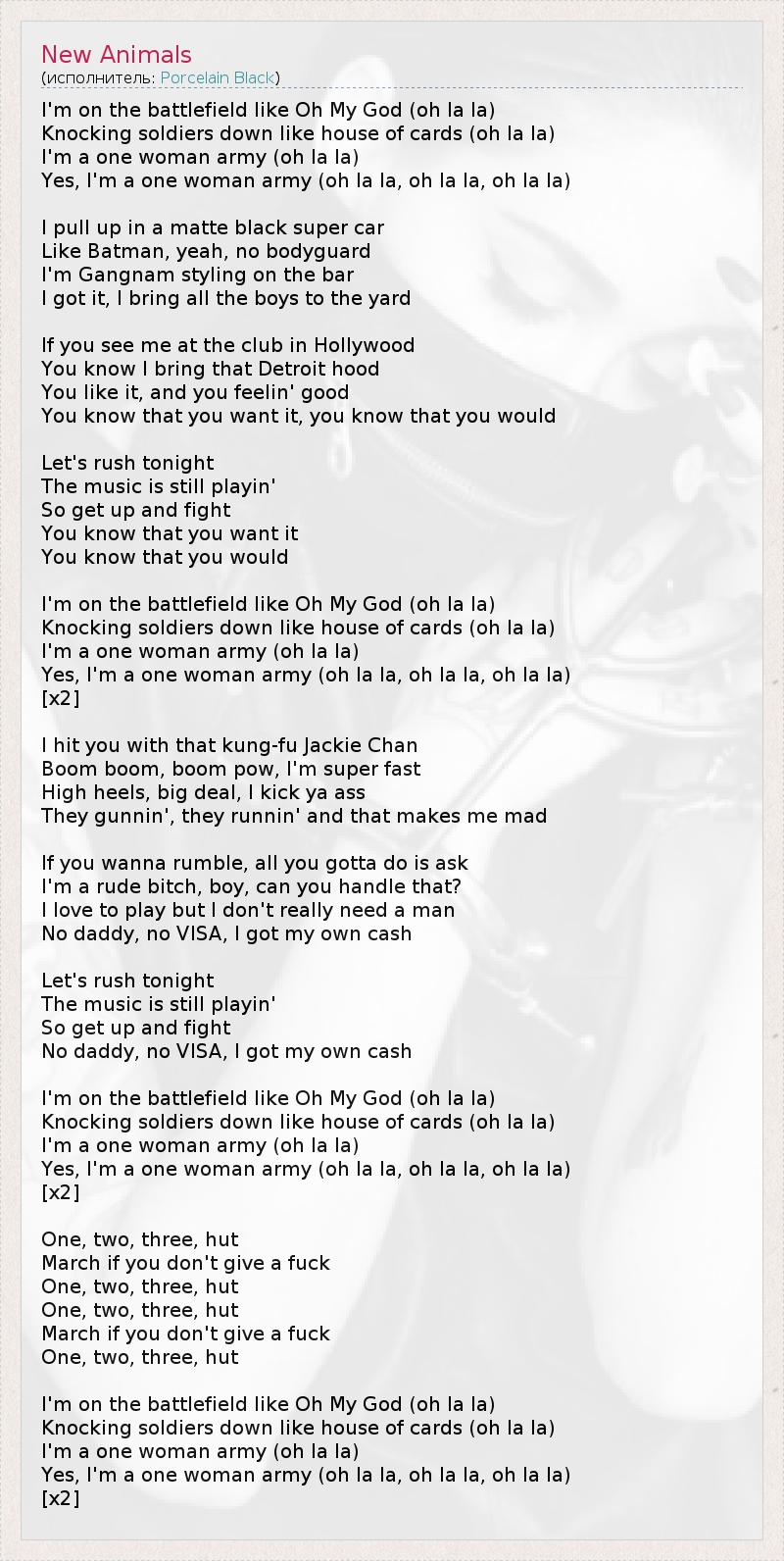 Я на поле боя, и все кричат: "О Боже!" (о-ла-ла) Разбиваю солдат, как карточный домик (о-ла-ла) Я - сама себе армия 1 (о-ла-ла) Да, я - женщина-армия (о-ла-ла, о-ла-ла, о-ла-ла) Подъезжаю на матовом черном суперкаре Словно Бэтмен, да, без охраны. Танцую "Gangnam style" на барной стойке, Готово - все парни собрались вокруг меня! Если видишь меня в голливудском клубе, Знай, что я привожу с собой всю тусовку Детройта. Тебе это нравится, тебе хорошо, Ты знаешь, что хочешь этого, и знаешь, что тебе это по силам... Не будем тянуть время в этот вечер, Музыка все еще играет, Так что вставай и отправляйся на бой. Ты знаешь, что хочешь этого, Знаешь, что тебе это по силам... Я на поле боя, и все кричат: "О Боже!" (о-ла-ла) Разбиваю солдат, как карточный домик (о-ла-ла) Я - сама себе армия (о-ла-ла) Да, я - женщина-армия (о-ла-ла, о-ла-ла, о-ла-ла) [x2] Я свалю тебя с ног кунг-фу Джеки Чана, Бум-бум, трах-бабах, я супер-быстрая! Высокие каблуки мне не помеха, я надеру твой зад. Кто-то стреляет, все бегут - и это выводит меня из себя... Хочешь драки - только попроси, Я грубая стерва, парень, ты справишься с такой? Я люблю поиграть, но могу обойтись и без мужчины, Нет, папочка, никаких VISA, у меня есть наличка... Не будем тянуть время в этот вечер. Музыка все еще играет, Так что вставай и отправляйся на бой. Нет, папочка, никаких VISA, у меня есть наличка... Я на поле боя, и все кричат: "О Боже!" (о-ла-ла) Разбиваю солдат, как карточный домик (о-ла-ла) Я - сама себе армия (о-ла-ла) Да, я - женщина-армия (о-ла-ла, о-ла-ла, о-ла-ла) [x2] Раз, два, три, Маршируйте, если вам наплевать, Раз, два, три, Раз, два, три, Маршируйте, если вам наплевать, Раз, два, три! Я на поле боя, и все кричат: "О Боже!" (о-ла-ла) Разбиваю солдат, как карточный домик (о-ла-ла) Я - сама себе армия (о-ла-ла) Да, я - женщина-армия (о-ла-ла, о-ла-ла, о-ла-ла) [x2] 1 - Дословно: "Одна в поле воительница"