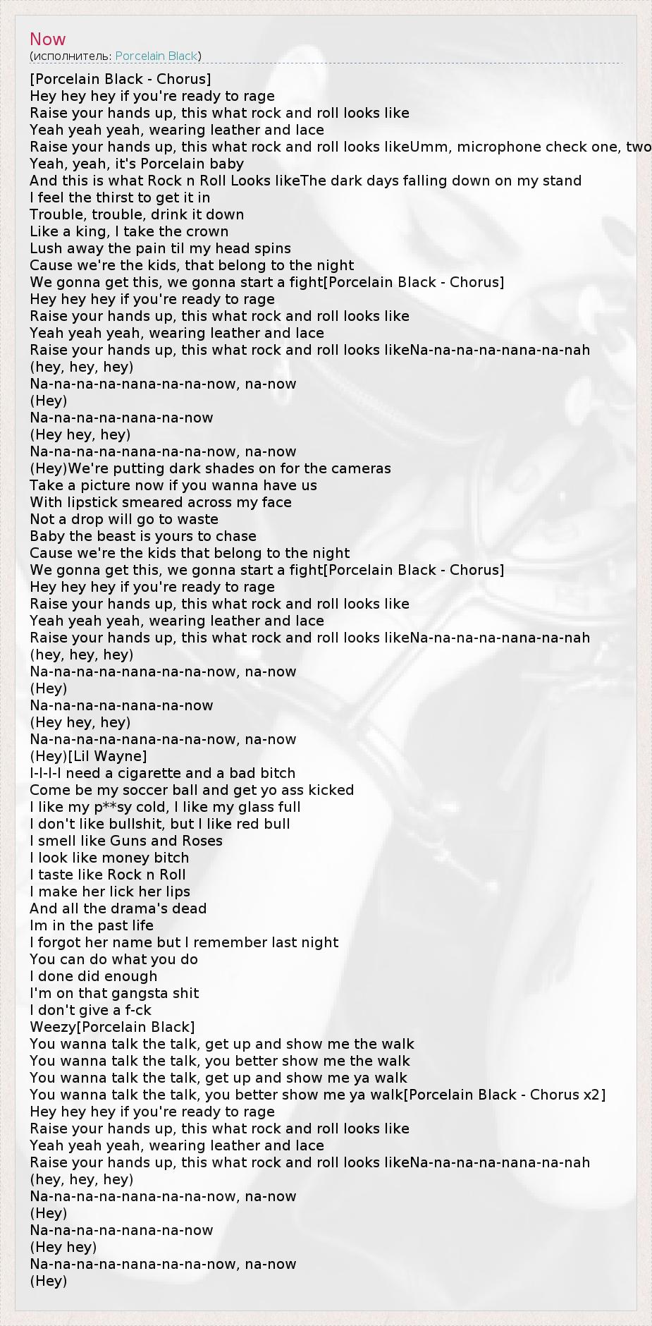 [Porcelain Black - Chorus] Hey hey hey if you're ready to rage Raise your hands up, this what rock and roll looks like Yeah yeah yeah, wearing leather and lace Raise your hands up, this what rock and roll looks likeUmm, microphone check one, two Yeah, yeah, it's Porcelain baby And this is what Rock n Roll Looks likeThe dark days falling down on my stand I feel the thirst to get it in Trouble, trouble, drink it down Like a king, I take the crown Lush away the pain til my head spins Cause we're the kids, that belong to the night We gonna get this, we gonna start a fight[Porcelain Black - Chorus] Hey hey hey if you're ready to rage Raise your hands up, this what rock and roll looks like Yeah yeah yeah, wearing leather and lace Raise your hands up, this what rock and roll looks likeNa-na-na-na-nana-na-nah (hey, hey, hey) Na-na-na-na-nana-na-na-now, na-now (Hey) Na-na-na-na-nana-na-now (Hey hey, hey) Na-na-na-na-nana-na-na-now, na-now (Hey)We're putting dark shades on for the cameras Take a picture now if you wanna have us With lipstick smeared across my face Not a drop will go to waste Baby the beast is yours to chase Cause we're the kids that belong to the night We gonna get this, we gonna start a fight[Porcelain Black - Chorus] Hey hey hey if you're ready to rage Raise your hands up, this what rock and roll looks like Yeah yeah yeah, wearing leather and lace Raise your hands up, this what rock and roll looks likeNa-na-na-na-nana-na-nah (hey, hey, hey) Na-na-na-na-nana-na-na-now, na-now (Hey) Na-na-na-na-nana-na-now (Hey hey, hey) Na-na-na-na-nana-na-na-now, na-now (Hey)[Lil Wayne] I-I-I-I need a cigarette and a bad bitch Come be my soccer ball and get yo ass kicked I like my p**sy cold, I like my glass full I don't like bullshit, but I like red bull I smell like Guns and Roses I look like money bitch I taste like Rock n Roll I make her lick her lips And all the drama's dead Im in the past life I forgot her name but I remember last night You can do what you do I done did enough I'm on that gangsta shit I don't give a f-ck Weezy[Porcelain Black] You wanna talk the talk, get up and show me the walk You wanna talk the talk, you better show me the walk You wanna talk the talk, get up and show me ya walk You wanna talk the talk, you better show me ya walk[Porcelain Black - Chorus x2] Hey hey hey if you're ready to rage Raise your hands up, this what rock and roll looks like Yeah yeah yeah, wearing leather and lace Raise your hands up, this what rock and roll looks likeNa-na-na-na-nana-na-nah (hey, hey, hey) Na-na-na-na-nana-na-na-now, na-now (Hey) Na-na-na-na-nana-na-now (Hey hey) Na-na-na-na-nana-na-na-now, na-now (Hey)