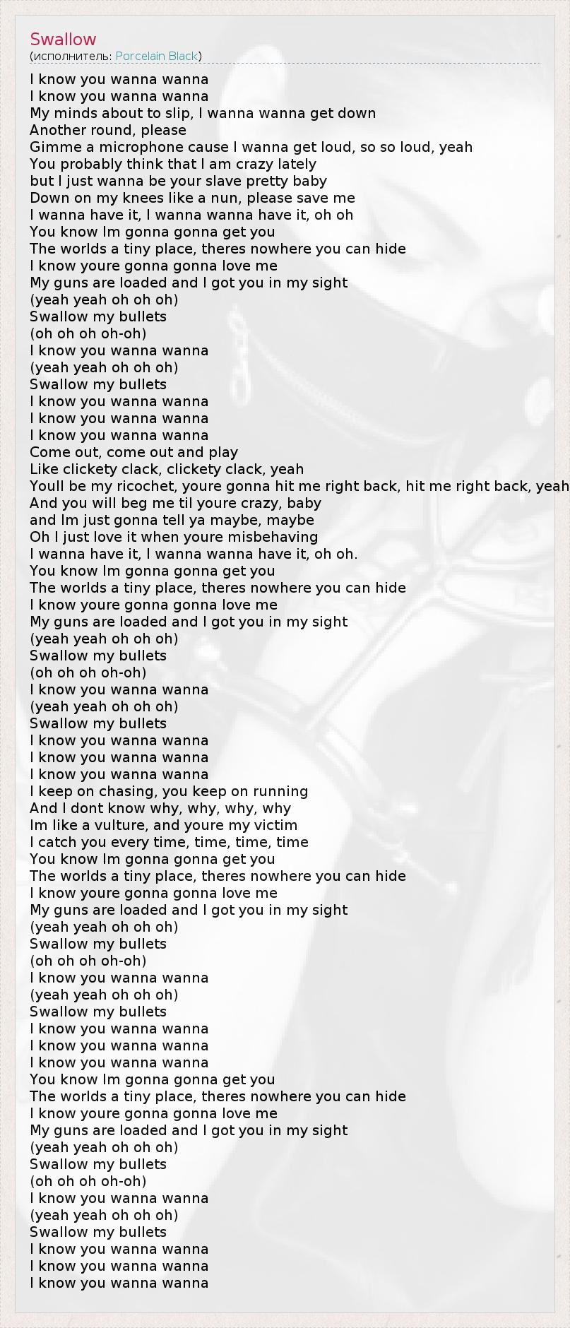 I know you wanna wanna I know you wanna wanna My minds about to slip, I wanna wanna get down Another round, please Gimme a microphone cause I wanna get loud, so so loud, yeah You probably think that I am crazy lately but I just wanna be your slave pretty baby Down on my knees like a nun, please save me I wanna have it, I wanna wanna have it, oh oh You know Im gonna gonna get you The worlds a tiny place, theres nowhere you can hide I know youre gonna gonna love me My guns are loaded and I got you in my sight (yeah yeah oh oh oh) Swallow my bullets (oh oh oh oh-oh) I know you wanna wanna (yeah yeah oh oh oh) Swallow my bullets I know you wanna wanna I know you wanna wanna I know you wanna wanna Come out, come out and play Like clickety clack, clickety clack, yeah Youll be my ricochet, youre gonna hit me right back, hit me right back, yeah And you will beg me til youre crazy, baby and Im just gonna tell ya maybe, maybe Oh I just love it when youre misbehaving I wanna have it, I wanna wanna have it, oh oh. You know Im gonna gonna get you The worlds a tiny place, theres nowhere you can hide I know youre gonna gonna love me My guns are loaded and I got you in my sight (yeah yeah oh oh oh) Swallow my bullets (oh oh oh oh-oh) I know you wanna wanna (yeah yeah oh oh oh) Swallow my bullets I know you wanna wanna I know you wanna wanna I know you wanna wanna I keep on chasing, you keep on running And I dont know why, why, why, why Im like a vulture, and youre my victim I catch you every time, time, time, time You know Im gonna gonna get you The worlds a tiny place, theres nowhere you can hide I know youre gonna gonna love me My guns are loaded and I got you in my sight (yeah yeah oh oh oh) Swallow my bullets (oh oh oh oh-oh) I know you wanna wanna (yeah yeah oh oh oh) Swallow my bullets I know you wanna wanna I know you wanna wanna I know you wanna wanna You know Im gonna gonna get you The worlds a tiny place, theres nowhere you can hide I know youre gonna gonna love me My guns are loaded and I got you in my sight (yeah yeah oh oh oh) Swallow my bullets (oh oh oh oh-oh) I know you wanna wanna (yeah yeah oh oh oh) Swallow my bullets I know you wanna wanna I know you wanna wanna I know you wanna wanna