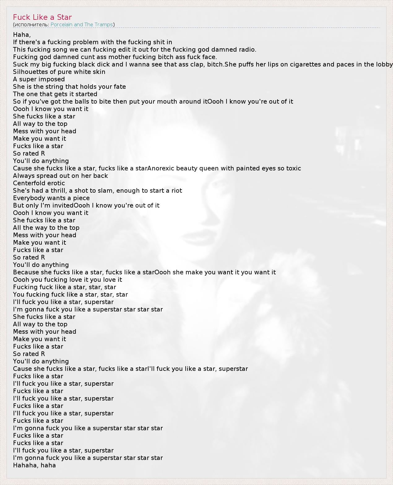 Haha, If there's a fucking problem with the fucking shit in This fucking song we can fucking edit it out for the fucking god damned radio. Fucking god damned cunt ass mother fucking bitch ass fuck face. Suck my big fucking black dick and I wanna see that ass clap, bitch.She puffs her lips on cigarettes and paces in the lobby Silhouettes of pure white skin A super imposed She is the string that holds your fate The one that gets it started So if you've got the balls to bite then put your mouth around itOooh I know you're out of it Oooh I know you want it She fucks like a star All way to the top Mess with your head Make you want it Fucks like a star So rated R You'll do anything Cause she fucks like a star, fucks like a starAnorexic beauty queen with painted eyes so toxic Always spread out on her back Centerfold erotic She's had a thrill, a shot to slam, enough to start a riot Everybody wants a piece But only I'm invitedOooh I know you're out of it Oooh I know you want it She fucks like a star All the way to the top Mess with your head Make you want it Fucks like a star So rated R You'll do anything Because she fucks like a star, fucks like a starOooh she make you want it you want it Oooh you fucking love it you love it Fucking fuck like a star, star, star You fucking fuck like a star, star, star I'll fuck you like a star, superstar I'm gonna fuck you like a superstar star star star She fucks like a star All way to the top Mess with your head Make you want it Fucks like a star So rated R You'll do anything Cause she fucks like a star, fucks like a starI'll fuck you like a star, superstar Fucks like a star I'll fuck you like a star, superstar Fucks like a star I'll fuck you like a star, superstar Fucks like a star I'll fuck you like a star, superstar Fucks like a star I'm gonna fuck you like a superstar star star star Fucks like a star Fucks like a star I'll fuck you like a star, superstar I'm gonna fuck you like a superstar star star star Hahaha, haha