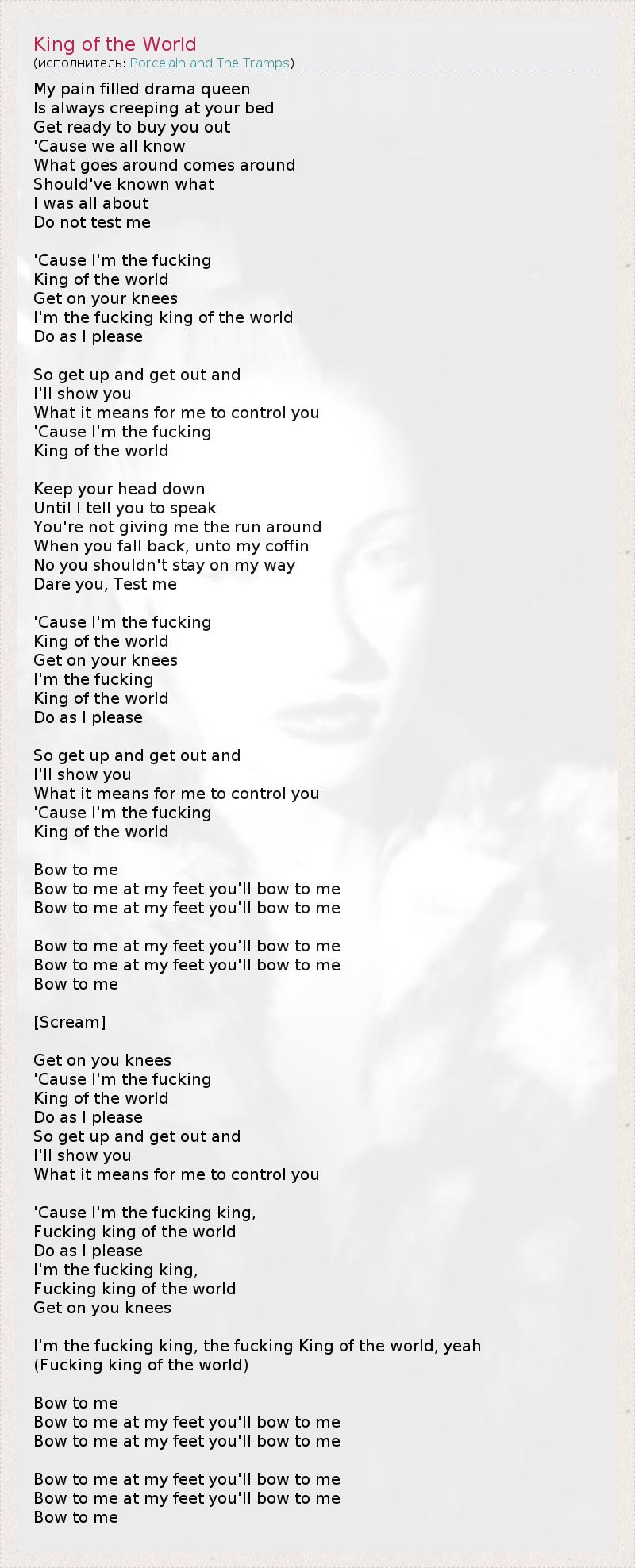 Моя страдающая королева трагедии Всегда ползает по твой постели. Приготовься выкупать себя, Ведь все мы знаем, что Как аукнется, так и откликнется. Тебе следовало знать, Что я за всем этим стою, Не нужно меня испытывать. Да я, блин, Король мира! На колени! Да я, блин, король мира! Делай, как я пожелаю. Так что вставай и проваливай, И я покажу, как это - Быть под моим контролем. Да я, блин, Король мира! Пригибай голову, Пока я не разрешу говорить. И не смей меня дурачить. Когда ты отступаешь назад к моему гробу, Лучше не попадайся мне на глаза! Давай, попробуй испытать меня. Да я, блин, Король мира! На колени! Да я блин, Король мира! Делай, как я пожелаю. Так что вставай и проваливай, И я покажу, как это - Быть под моим контролем. Да я, блин, Король мира! Кланяйся мне, Кланяйся мне в ноги, ты поклонишься мне! Кланяйся мне в ноги, ты поклонишься мне! Кланяйся мне, кланяйся мне в ноги, Ты поклонишься мне! Кланяйся мне в ноги, Ты поклонишься мне! [Крик] На колени! Да я, блин, Король мира! Делай, как я пожелаю. Так что вставай и проваливай, И я покажу, как это - Быть под моим контролем. Да я, блин, король, Да я, блин, король мира! Делай, как я пожелаю. Да я, блин, король, Да я, блин, король мира! На колени! Да я, блин, король, да я, блин, король мира, да! (Король мира, блин) Кланяйся мне, Кланяйся мне в ноги, ты поклонишься мне! Кланяйся мне в ноги, Ты поклонишься мне! Кланяйся мне, кланяйся мне в ноги, Ты поклонишься мне! Кланяйся мне в ноги, Ты поклонишься мне!