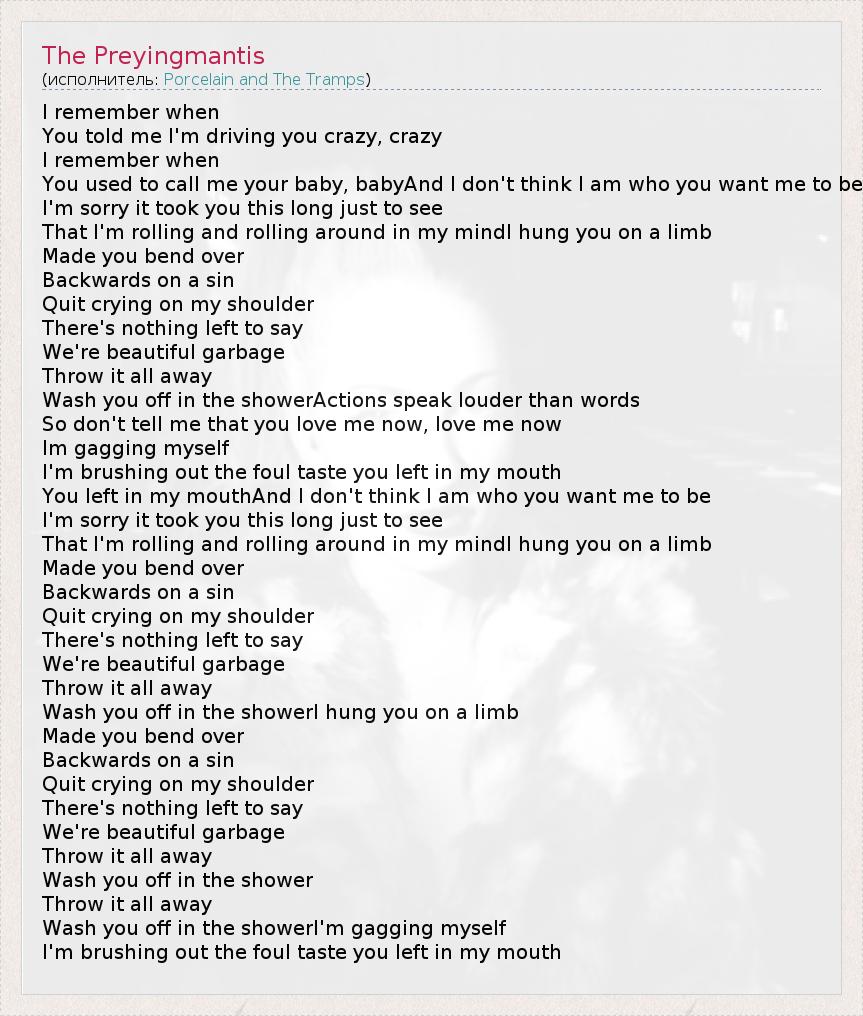 I remember when You told me I'm driving you crazy, crazy I remember when You used to call me your baby, babyAnd I don't think I am who you want me to be I'm sorry it took you this long just to see That I'm rolling and rolling around in my mindI hung you on a limb Made you bend over Backwards on a sin Quit crying on my shoulder There's nothing left to say We're beautiful garbage Throw it all away Wash you off in the showerActions speak louder than words So don't tell me that you love me now, love me now Im gagging myself I'm brushing out the foul taste you left in my mouth You left in my mouthAnd I don't think I am who you want me to be I'm sorry it took you this long just to see That I'm rolling and rolling around in my mindI hung you on a limb Made you bend over Backwards on a sin Quit crying on my shoulder There's nothing left to say We're beautiful garbage Throw it all away Wash you off in the showerI hung you on a limb Made you bend over Backwards on a sin Quit crying on my shoulder There's nothing left to say We're beautiful garbage Throw it all away Wash you off in the shower Throw it all away Wash you off in the showerI'm gagging myself I'm brushing out the foul taste you left in my mouth