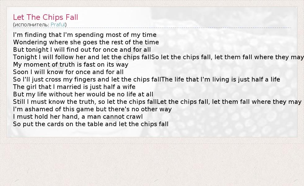 I'm finding that I'm spending most of my time Wondering where she goes the rest of the time But tonight I will find out for once and for all Tonight I will follow her and let the chips fallSo let the chips fall, let them fall where they may My moment of truth is fast on its way Soon I will know for once and for all So I'll just cross my fingers and let the chips fallThe life that I'm living is just half a life The girl that I married is just half a wife But my life without her would be no life at all Still I must know the truth, so let the chips fallLet the chips fall, let them fall where they may I'm ashamed of this game but there's no other way I must hold her hand, a man cannot crawl So put the cards on the table and let the chips fall