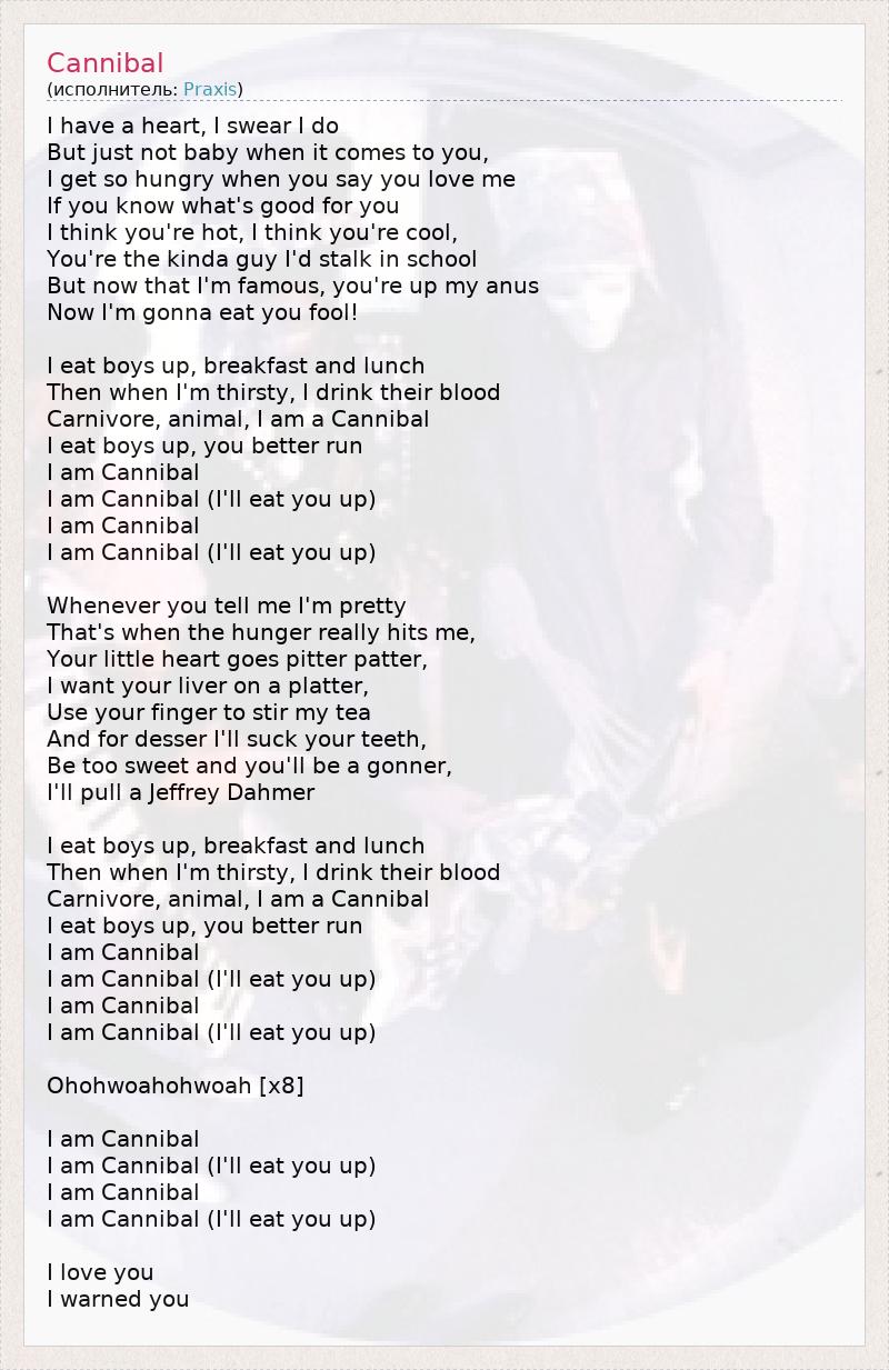 У меня есть сердце, я клянусь, Но совсем не ребёнка, когда это касается тебя, Я так голодна, когда ты говоришь, что любишь меня, Если ты знаешь, что для тебя лучше, Я думаю, ты горяч, я думаю, ты крут, Ты как парень, которого я преследовала в школе, Но сейчас я знаменита, а ты у меня в зад*ице, Теперь я собираюсь съесть тебя, дурак! Я ем мальчиков на завтрак и обед, Затем, когда я хочу пить, я пью их кровь, Хищник, животное, я людоед, Я ем мальчиков, тебе лучше бежать, Я людоед, Я людоед (я съем тебя) Я людоед, Я людоед (я съем тебя) Всякий раз, когда ты говоришь, что я хорошенькая, Вот когда у меня разыгрывается голод, Твоё маленькое сердце мелет пустую болтовню, Я хочу твою печень на блюде, Использую твой палец, чтобы перемешать чай И на десерт я пососу твои зубы, Будешь слишком сладким и тебе будет крышка, Я буду делать это, как Jeffrey Dahmer* Я ем мальчиков на завтрак и обед, Затем, когда я хочу пить, я пью их кровь, Хищник, животное, я людоед Я ем мальчиков, тебе лучше бежать, Я людоед, Я людоед (я съем тебя) Я людоед, Я людоед (я съем тебя) Оооуооуоо (8 раз) Я людоед Я людоед (я съем тебя) Я людоед Я людоед (я съем тебя) Я люблю тебя Я предупреждала тебя * Jeffrey Dahmer (21 мая 1960 – 28 ноября 1994) - американский серийный убийца и насильник. Им было убито 17 мужчин и подростков - многие из которых были африканского или азиатского происхождения - между 1978 и 1991 годами, при этом большинство из убийств, произошли в период между 1987 и 1991 годами.