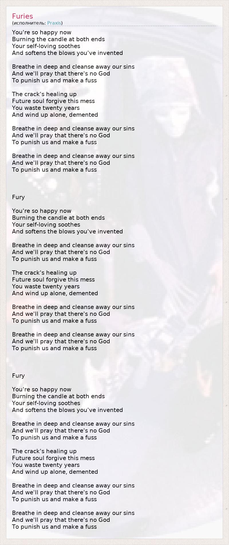You're so happy now Burning the candle at both ends Your self-loving soothes And softens the blows you've invented Breathe in deep and cleanse away our sins And we'll pray that there's no God To punish us and make a fuss The crack's healing up Future soul forgive this mess You waste twenty years And wind up alone, demented Breathe in deep and cleanse away our sins And we'll pray that there's no God To punish us and make a fuss Breathe in deep and cleanse away our sins And we'll pray that there's no God To punish us and make a fuss Fury You're so happy now Burning the candle at both ends Your self-loving soothes And softens the blows you've invented Breathe in deep and cleanse away our sins And we'll pray that there's no God To punish us and make a fuss The crack's healing up Future soul forgive this mess You waste twenty years And wind up alone, demented Breathe in deep and cleanse away our sins And we'll pray that there's no God To punish us and make a fuss Breathe in deep and cleanse away our sins And we'll pray that there's no God To punish us and make a fuss Fury You're so happy now Burning the candle at both ends Your self-loving soothes And softens the blows you've invented Breathe in deep and cleanse away our sins And we'll pray that there's no God To punish us and make a fuss The crack's healing up Future soul forgive this mess You waste twenty years And wind up alone, demented Breathe in deep and cleanse away our sins And we'll pray that there's no God To punish us and make a fuss Breathe in deep and cleanse away our sins And we'll pray that there's no God To punish us and make a fuss