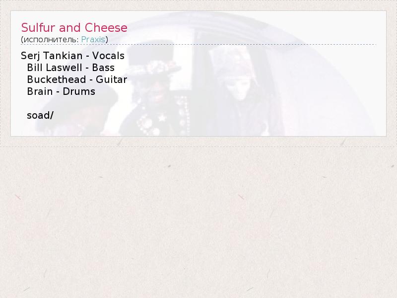 Serj Tankian - Vocals Bill Laswell - Bass Buckethead - Guitar Brain - Drums soad/