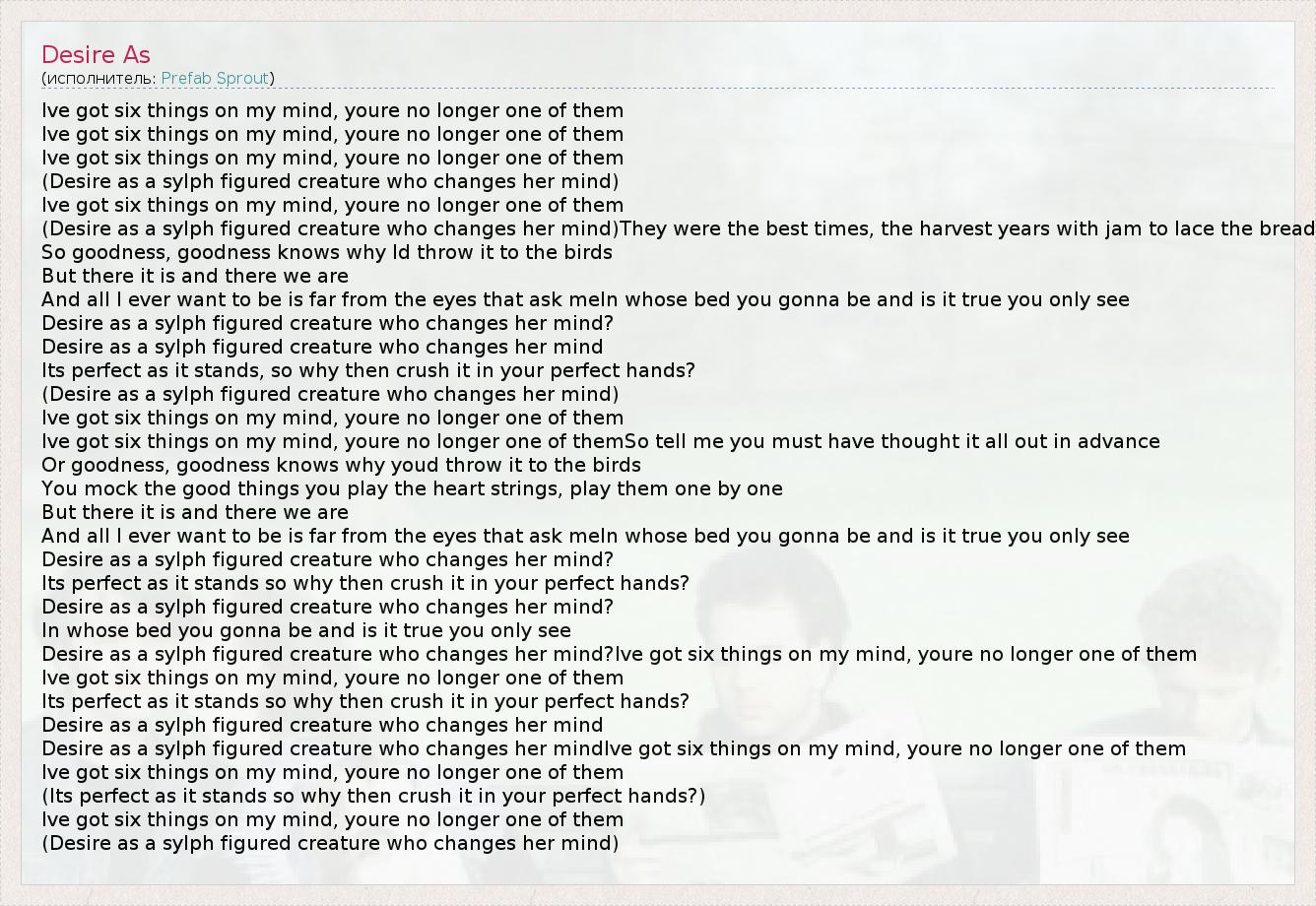 Ive got six things on my mind, youre no longer one of them Ive got six things on my mind, youre no longer one of them Ive got six things on my mind, youre no longer one of them (Desire as a sylph figured creature who changes her mind) Ive got six things on my mind, youre no longer one of them (Desire as a sylph figured creature who changes her mind)They were the best times, the harvest years with jam to lace the bread So goodness, goodness knows why Id throw it to the birds But there it is and there we are And all I ever want to be is far from the eyes that ask meIn whose bed you gonna be and is it true you only see Desire as a sylph figured creature who changes her mind? Desire as a sylph figured creature who changes her mind Its perfect as it stands, so why then crush it in your perfect hands? (Desire as a sylph figured creature who changes her mind) Ive got six things on my mind, youre no longer one of them Ive got six things on my mind, youre no longer one of themSo tell me you must have thought it all out in advance Or goodness, goodness knows why youd throw it to the birds You mock the good things you play the heart strings, play them one by one But there it is and there we are And all I ever want to be is far from the eyes that ask meIn whose bed you gonna be and is it true you only see Desire as a sylph figured creature who changes her mind? Its perfect as it stands so why then crush it in your perfect hands? Desire as a sylph figured creature who changes her mind? In whose bed you gonna be and is it true you only see Desire as a sylph figured creature who changes her mind?Ive got six things on my mind, youre no longer one of them Ive got six things on my mind, youre no longer one of them Its perfect as it stands so why then crush it in your perfect hands? Desire as a sylph figured creature who changes her mind Desire as a sylph figured creature who changes her mindIve got six things on my mind, youre no longer one of them Ive got six things on my mind, youre no longer one of them (Its perfect as it stands so why then crush it in your perfect hands?) Ive got six things on my mind, youre no longer one of them (Desire as a sylph figured creature who changes her mind)