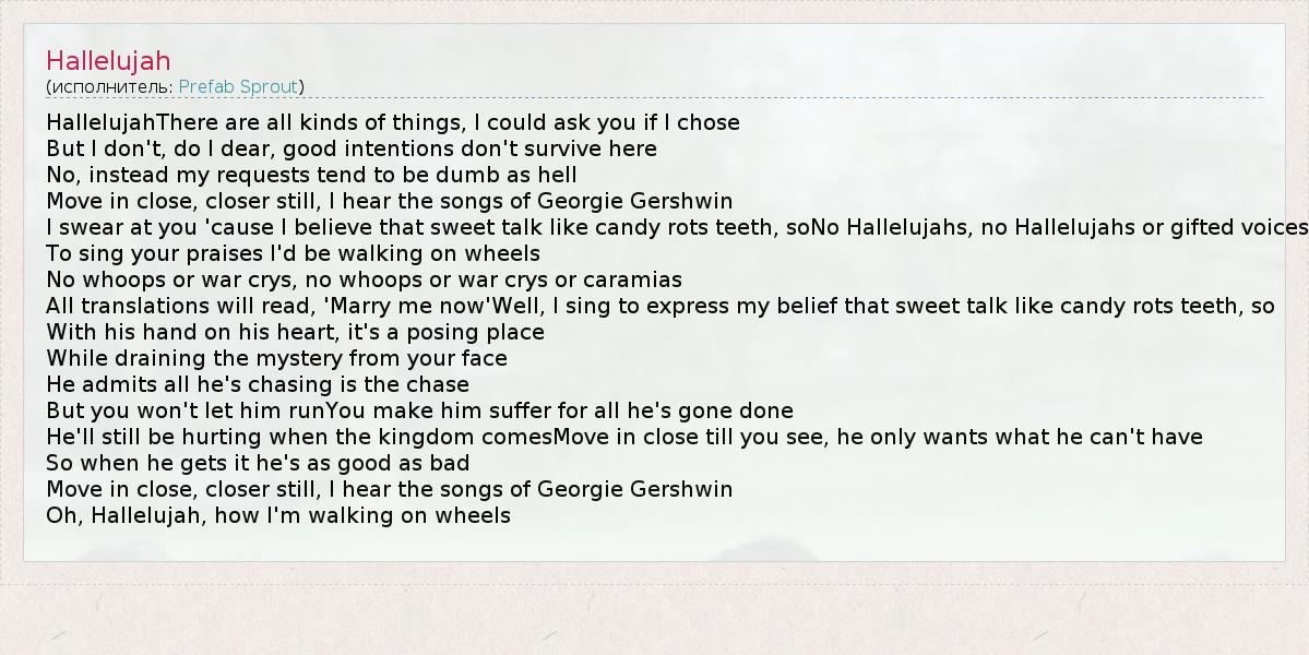 HallelujahThere are all kinds of things, I could ask you if I chose But I don't, do I dear, good intentions don't survive here No, instead my requests tend to be dumb as hell Move in close, closer still, I hear the songs of Georgie Gershwin I swear at you 'cause I believe that sweet talk like candy rots teeth, soNo Hallelujahs, no Hallelujahs or gifted voices To sing your praises I'd be walking on wheels No whoops or war crys, no whoops or war crys or caramias All translations will read, 'Marry me now'Well, I sing to express my belief that sweet talk like candy rots teeth, so With his hand on his heart, it's a posing place While draining the mystery from your face He admits all he's chasing is the chase But you won't let him runYou make him suffer for all he's gone done He'll still be hurting when the kingdom comesMove in close till you see, he only wants what he can't have So when he gets it he's as good as bad Move in close, closer still, I hear the songs of Georgie Gershwin Oh, Hallelujah, how I'm walking on wheels