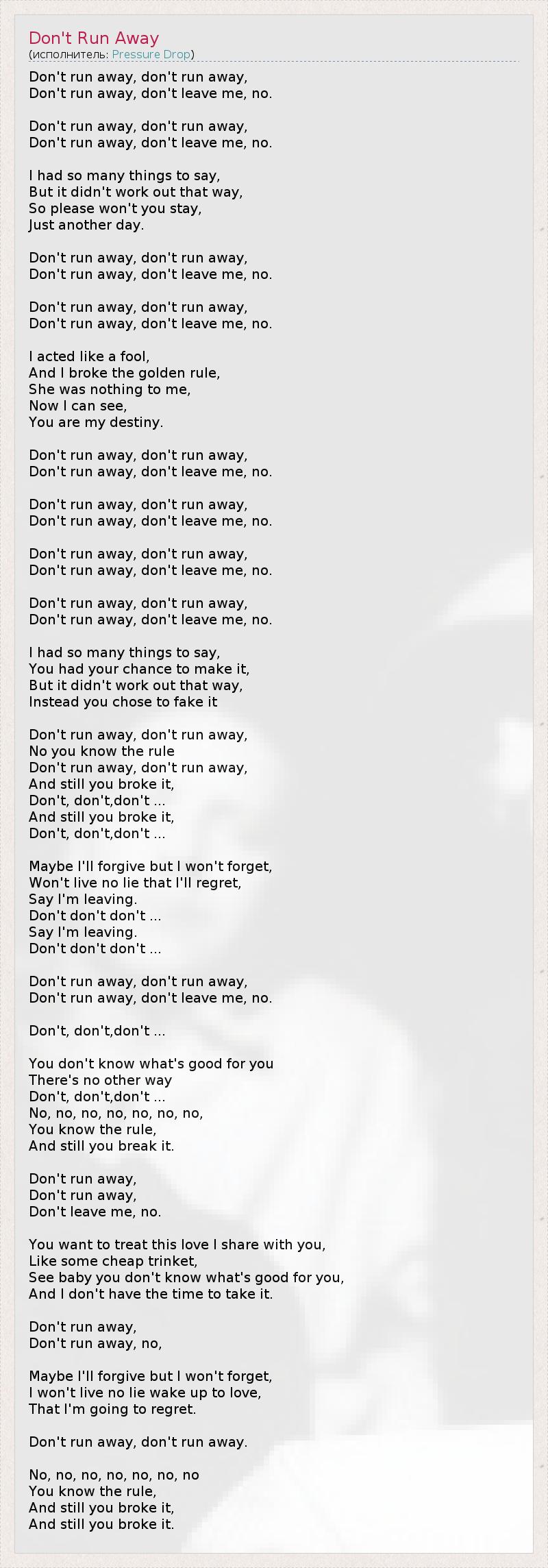 Don't run away, don't run away, Don't run away, don't leave me, no. Don't run away, don't run away, Don't run away, don't leave me, no. I had so many things to say, But it didn't work out that way, So please won't you stay, Just another day. Don't run away, don't run away, Don't run away, don't leave me, no. Don't run away, don't run away, Don't run away, don't leave me, no. I acted like a fool, And I broke the golden rule, She was nothing to me, Now I can see, You are my destiny. Don't run away, don't run away, Don't run away, don't leave me, no. Don't run away, don't run away, Don't run away, don't leave me, no. Don't run away, don't run away, Don't run away, don't leave me, no. Don't run away, don't run away, Don't run away, don't leave me, no. I had so many things to say, You had your chance to make it, But it didn't work out that way, Instead you chose to fake it Don't run away, don't run away, No you know the rule Don't run away, don't run away, And still you broke it, Don't, don't,don't ... And still you broke it, Don't, don't,don't ... Maybe I'll forgive but I won't forget, Won't live no lie that I'll regret, Say I'm leaving. Don't don't don't ... Say I'm leaving. Don't don't don't ... Don't run away, don't run away, Don't run away, don't leave me, no. Don't, don't,don't ... You don't know what's good for you There's no other way Don't, don't,don't ... No, no, no, no, no, no, no, You know the rule, And still you break it. Don't run away, Don't run away, Don't leave me, no. You want to treat this love I share with you, Like some cheap trinket, See baby you don't know what's good for you, And I don't have the time to take it. Don't run away, Don't run away, no, Maybe I'll forgive but I won't forget, I won't live no lie wake up to love, That I'm going to regret. Don't run away, don't run away. No, no, no, no, no, no, no You know the rule, And still you broke it, And still you broke it.
