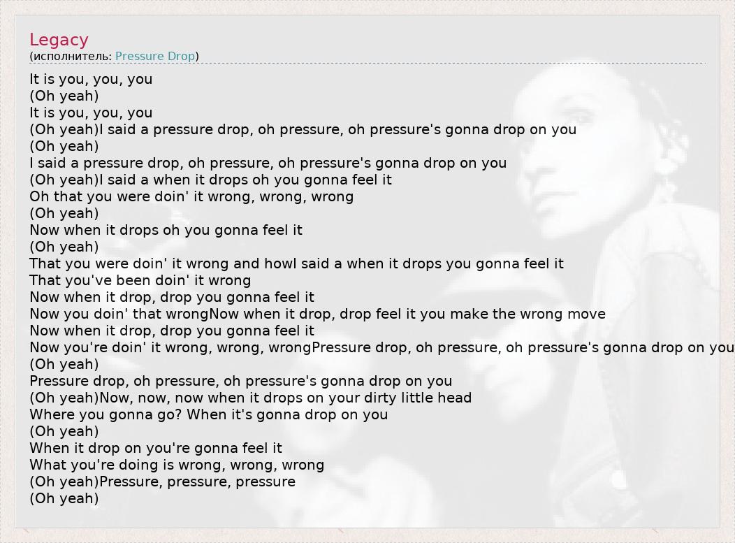 It is you, you, you (Oh yeah) It is you, you, you (Oh yeah)I said a pressure drop, oh pressure, oh pressure's gonna drop on you (Oh yeah) I said a pressure drop, oh pressure, oh pressure's gonna drop on you (Oh yeah)I said a when it drops oh you gonna feel it Oh that you were doin' it wrong, wrong, wrong (Oh yeah) Now when it drops oh you gonna feel it (Oh yeah) That you were doin' it wrong and howI said a when it drops you gonna feel it That you've been doin' it wrong Now when it drop, drop you gonna feel it Now you doin' that wrongNow when it drop, drop feel it you make the wrong move Now when it drop, drop you gonna feel it Now you're doin' it wrong, wrong, wrongPressure drop, oh pressure, oh pressure's gonna drop on you (Oh yeah) Pressure drop, oh pressure, oh pressure's gonna drop on you (Oh yeah)Now, now, now when it drops on your dirty little head Where you gonna go? When it's gonna drop on you (Oh yeah) When it drop on you're gonna feel it What you're doing is wrong, wrong, wrong (Oh yeah)Pressure, pressure, pressure (Oh yeah)
