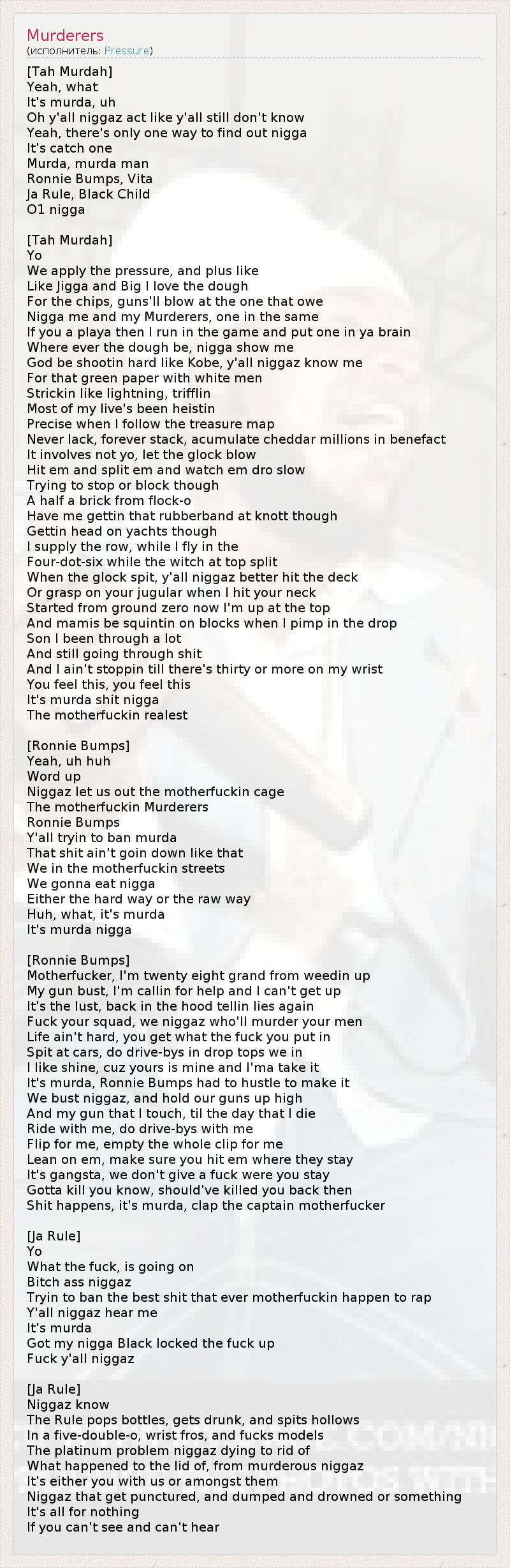 [Tah Murdah] Yeah, what It's murda, uh Oh y'all niggaz act like y'all still don't know Yeah, there's only one way to find out nigga It's catch one Murda, murda man Ronnie Bumps, Vita Ja Rule, Black Child O1 nigga [Tah Murdah] Yo We apply the pressure, and plus like Like Jigga and Big I love the dough For the chips, guns'll blow at the one that owe Nigga me and my Murderers, one in the same If you a playa then I run in the game and put one in ya brain Where ever the dough be, nigga show me God be shootin hard like Kobe, y'all niggaz know me For that green paper with white men Strickin like lightning, trifflin Most of my live's been heistin Precise when I follow the treasure map Never lack, forever stack, acumulate cheddar millions in benefact It involves not yo, let the glock blow Hit em and split em and watch em dro slow Trying to stop or block though A half a brick from flock-o Have me gettin that rubberband at knott though Gettin head on yachts though I supply the row, while I fly in the Four-dot-six while the witch at top split When the glock spit, y'all niggaz better hit the deck Or grasp on your jugular when I hit your neck Started from ground zero now I'm up at the top And mamis be squintin on blocks when I pimp in the drop Son I been through a lot And still going through shit And I ain't stoppin till there's thirty or more on my wrist You feel this, you feel this It's murda shit nigga The motherfuckin realest [Ronnie Bumps] Yeah, uh huh Word up Niggaz let us out the motherfuckin cage The motherfuckin Murderers Ronnie Bumps Y'all tryin to ban murda That shit ain't goin down like that We in the motherfuckin streets We gonna eat nigga Either the hard way or the raw way Huh, what, it's murda It's murda nigga [Ronnie Bumps] Motherfucker, I'm twenty eight grand from weedin up My gun bust, I'm callin for help and I can't get up It's the lust, back in the hood tellin lies again Fuck your squad, we niggaz who'll murder your men Life ain't hard, you get what the fuck you put in Spit at cars, do drive-bys in drop tops we in I like shine, cuz yours is mine and I'ma take it It's murda, Ronnie Bumps had to hustle to make it We bust niggaz, and hold our guns up high And my gun that I touch, til the day that I die Ride with me, do drive-bys with me Flip for me, empty the whole clip for me Lean on em, make sure you hit em where they stay It's gangsta, we don't give a fuck were you stay Gotta kill you know, should've killed you back then Shit happens, it's murda, clap the captain motherfucker [Ja Rule] Yo What the fuck, is going on Bitch ass niggaz Tryin to ban the best shit that ever motherfuckin happen to rap Y'all niggaz hear me It's murda Got my nigga Black locked the fuck up Fuck y'all niggaz [Ja Rule] Niggaz know The Rule pops bottles, gets drunk, and spits hollows In a five-double-o, wrist fros, and fucks models The platinum problem niggaz dying to rid of What happened to the lid of, from murderous niggaz It's either you with us or amongst them Niggaz that get punctured, and dumped and drowned or something It's all for nothing If you can't see and can't hear