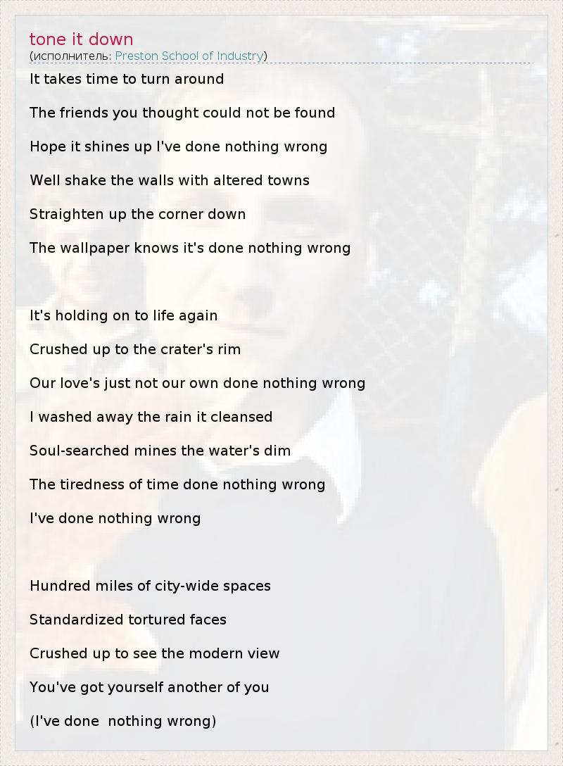 It takes time to turn around The friends you thought could not be found Hope it shines up I've done nothing wrong Well shake the walls with altered towns Straighten up the corner down The wallpaper knows it's done nothing wrong It's holding on to life again Crushed up to the crater's rim Our love's just not our own done nothing wrong I washed away the rain it cleansed Soul-searched mines the water's dim The tiredness of time done nothing wrong I've done nothing wrong Hundred miles of city-wide spaces Standardized tortured faces Crushed up to see the modern view You've got yourself another of you (I've done nothing wrong)