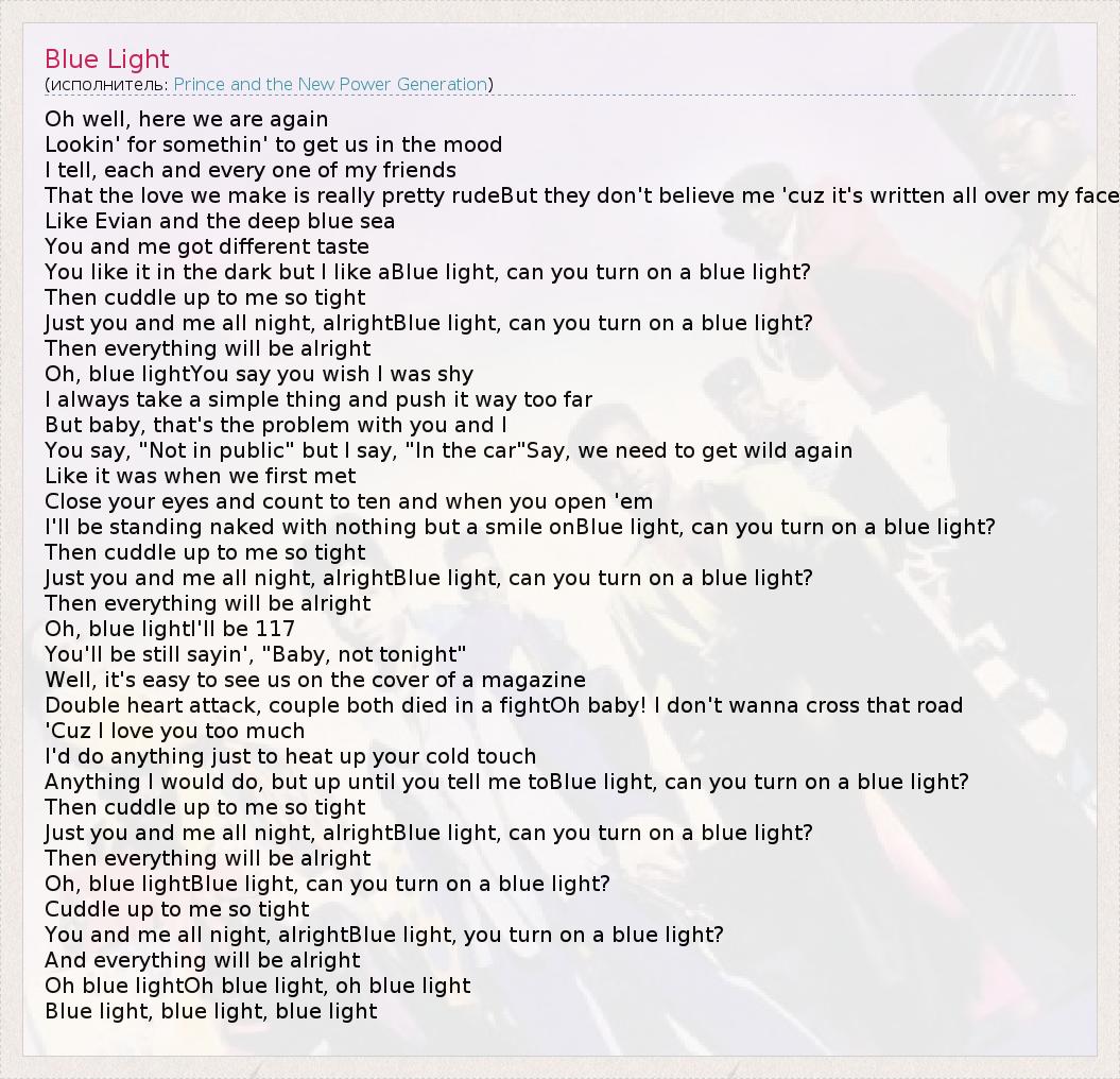 Oh well, here we are again Lookin' for somethin' to get us in the mood I tell, each and every one of my friends That the love we make is really pretty rudeBut they don't believe me 'cuz it's written all over my face Like Evian and the deep blue sea You and me got different taste You like it in the dark but I like aBlue light, can you turn on a blue light? Then cuddle up to me so tight Just you and me all night, alrightBlue light, can you turn on a blue light? Then everything will be alright Oh, blue lightYou say you wish I was shy I always take a simple thing and push it way too far But baby, that's the problem with you and I You say, "Not in public" but I say, "In the car"Say, we need to get wild again Like it was when we first met Close your eyes and count to ten and when you open 'em I'll be standing naked with nothing but a smile onBlue light, can you turn on a blue light? Then cuddle up to me so tight Just you and me all night, alrightBlue light, can you turn on a blue light? Then everything will be alright Oh, blue lightI'll be 117 You'll be still sayin', "Baby, not tonight" Well, it's easy to see us on the cover of a magazine Double heart attack, couple both died in a fightOh baby! I don't wanna cross that road 'Cuz I love you too much I'd do anything just to heat up your cold touch Anything I would do, but up until you tell me toBlue light, can you turn on a blue light? Then cuddle up to me so tight Just you and me all night, alrightBlue light, can you turn on a blue light? Then everything will be alright Oh, blue lightBlue light, can you turn on a blue light? Cuddle up to me so tight You and me all night, alrightBlue light, you turn on a blue light? And everything will be alright Oh blue lightOh blue light, oh blue light Blue light, blue light, blue light