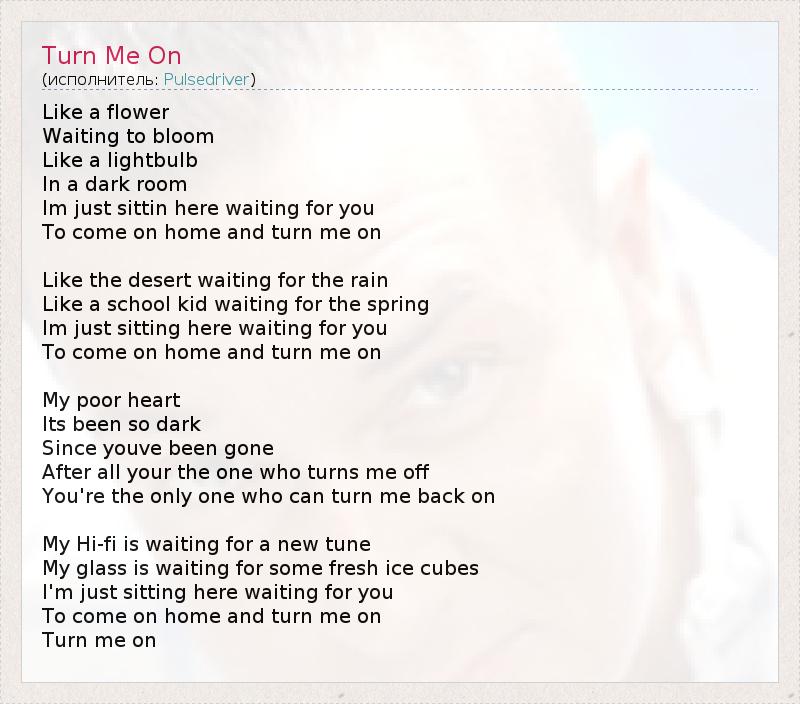 Like a flower Waiting to bloom Like a lightbulb In a dark room Im just sittin here waiting for you To come on home and turn me on Like the desert waiting for the rain Like a school kid waiting for the spring Im just sitting here waiting for you To come on home and turn me on My poor heart Its been so dark Since youve been gone After all your the one who turns me off You're the only one who can turn me back on My Hi-fi is waiting for a new tune My glass is waiting for some fresh ice cubes I'm just sitting here waiting for you To come on home and turn me on Turn me on