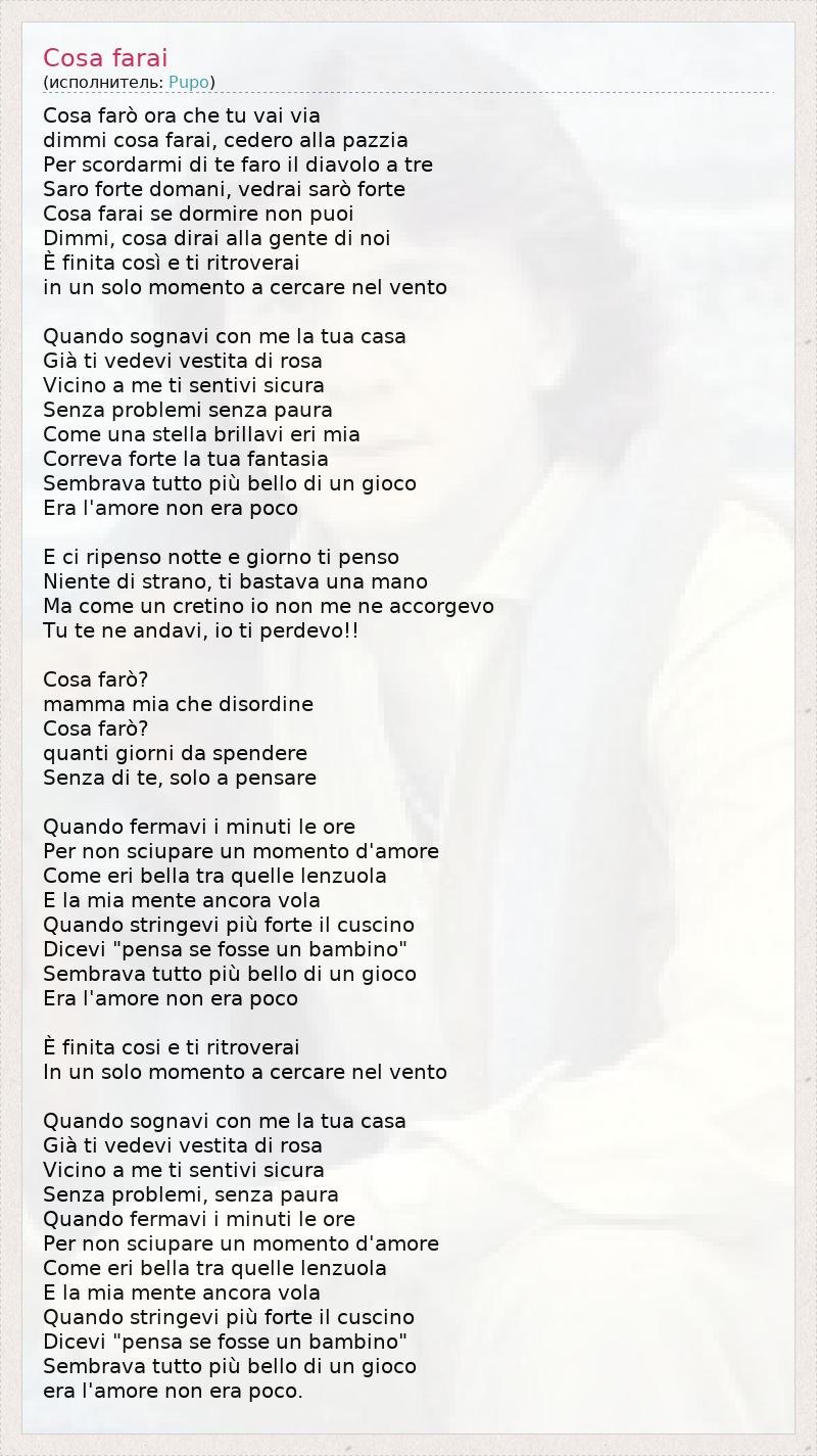 Коза Faro ора че ту вай через Dimmi Cosa Farai , cedero алла Pazzia За scordarmi ди те Фару иль Diavoloтре Саро форте Domani , vedrai Саро форте Коза Farai себе Dormire без puoi Dimmi , Cosa dirai алла Gente ди Ной Э. Finita così э ти ritroverai в ООН соло Momento с cercare Nel Vento Quando sognavi кон мне ла Туа Casa Già ти vedevi vestita ди Роза Vicinoменя ти sentivi SICURA Senza problemi Senza Paura Приходите уна Стелла brillavi эри миа Correva форте ла Туа фантазия Sembrava Tutto più Белло ди ООН Gioco Эра l' напиток , не эпоха Poco E CI ripenso Notte е Giorno ти Penso Niente ди Strano , ти bastava уна мано Ма пришел ООН Cretino ю без меня пе accorgevo Ту те пе andavi , и.о. ти perdevo ! Коза Faro? Mamma Mia че disordine Коза Faro? Quanti Giorni да spendere Senza ди те , солоpensare Quando fermavi я Minuti Le Ore За отсутствия sciupare Ун Моменто д'амур Приходите эри Белла тра Quelle lenzuola E La Mia Mente Ancora Vola Quando stringevi più форте иль Cuscino Dicevi " Пенза себе ров ООН Bambino " Sembrava Tutto più Белло ди ООН Gioco Эра l' напиток , не эпоха Poco Э. Finita Cosi э ти ritroverai В ООН соло Momento с cercare Nel Vento Quando sognavi кон мне ла Туа Casa Già ти vedevi vestita ди Роза Vicinoменя ти sentivi SICURA Senza problemi , Senza Paura Quando fermavi я Minuti Le Ore За отсутствия sciupare Ун Моменто д'амур Приходите эри Белла тра Quelle lenzuola E La Mia Mente Ancora Vola Quando stringevi più форте иль Cuscino Dicevi " Пенза себе ров ООН Bambino " Sembrava Tutto più Белло ди ООН Gioco Эпоха l' напиток , не эпоха Poco .