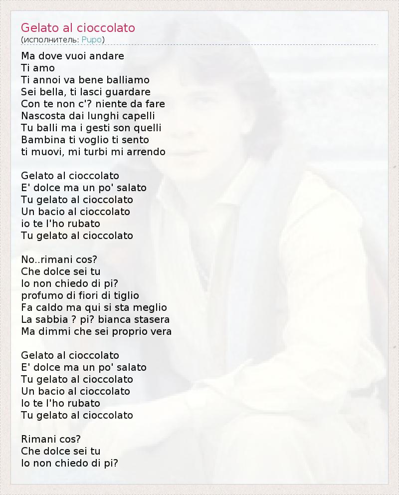 Ma dove vuoi andare Ti amo Ti annoi va bene balliamo Sei bella, ti lasci guardare Con te non c'? niente da fare Nascosta dai lunghi capelli Tu balli ma i gesti son quelli Bambina ti voglio ti sento ti muovi, mi turbi mi arrendo Gelato al cioccolato E' dolce ma un po' salato Tu gelato al cioccolato Un bacio al cioccolato io te l'ho rubato Tu gelato al cioccolato No..rimani cos? Che dolce sei tu Io non chiedo di pi? profumo di fiori di tiglio Fa caldo ma qui si sta meglio La sabbia ? pi? bianca stasera Ma dimmi che sei proprio vera Gelato al cioccolato E' dolce ma un po' salato Tu gelato al cioccolato Un bacio al cioccolato Io te l'ho rubato Tu gelato al cioccolato Rimani cos? Che dolce sei tu Io non chiedo di pi?