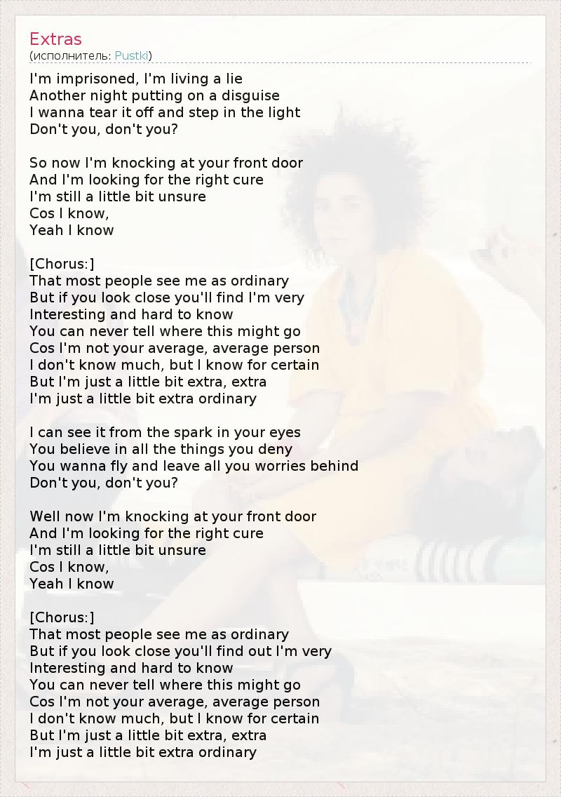 I'm imprisoned, I'm living a lie Another night putting on a disguise I wanna tear it off and step in the light Don't you, don't you? So now I'm knocking at your front door And I'm looking for the right cure I'm still a little bit unsure Cos I know, Yeah I know [Chorus:] That most people see me as ordinary But if you look close you'll find I'm very Interesting and hard to know You can never tell where this might go Cos I'm not your average, average person I don't know much, but I know for certain But I'm just a little bit extra, extra I'm just a little bit extra ordinary I can see it from the spark in your eyes You believe in all the things you deny You wanna fly and leave all you worries behind Don't you, don't you? Well now I'm knocking at your front door And I'm looking for the right cure I'm still a little bit unsure Cos I know, Yeah I know [Chorus:] That most people see me as ordinary But if you look close you'll find out I'm very Interesting and hard to know You can never tell where this might go Cos I'm not your average, average person I don't know much, but I know for certain But I'm just a little bit extra, extra I'm just a little bit extra ordinary