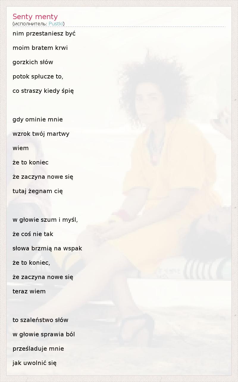 nim przestaniesz być moim bratem krwi gorzkich słów potok spłucze to, co straszy kiedy śpię gdy ominie mnie wzrok twój martwy wiem że to koniec że zaczyna nowe się tutaj żegnam cię w głowie szum i myśl, że coś nie tak słowa brzmią na wspak że to koniec, że zaczyna nowe się teraz wiem to szaleństwo słów w głowie sprawia ból prześladuje mnie jak uwolnić się