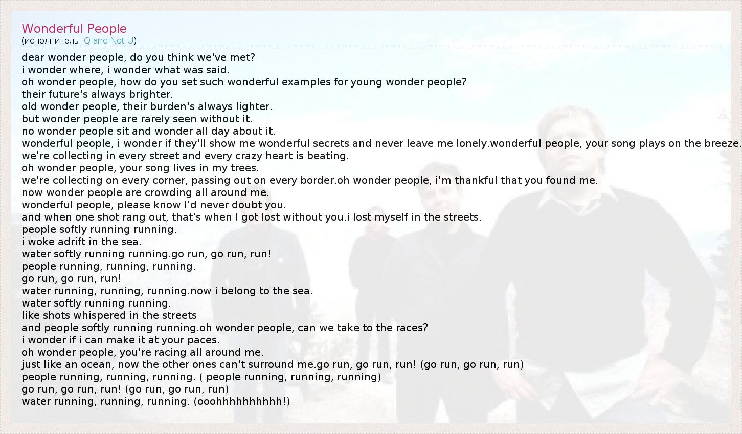 wonderful people, i wonder if they'll show me wonderful secrets and never leave me lonely.wonderful people, your song plays on the breeze.